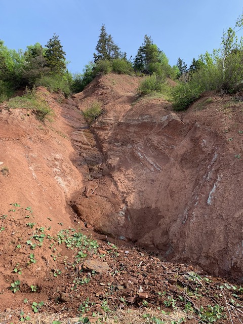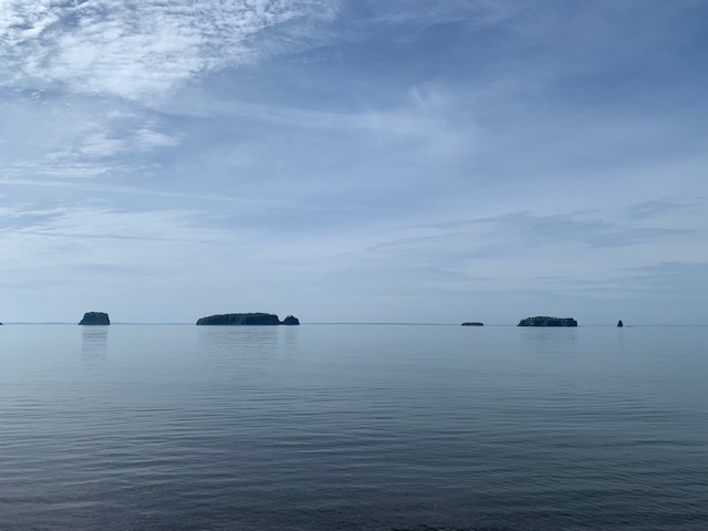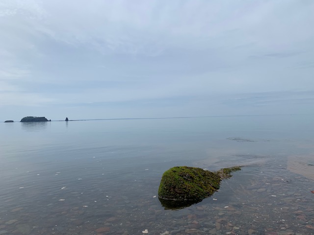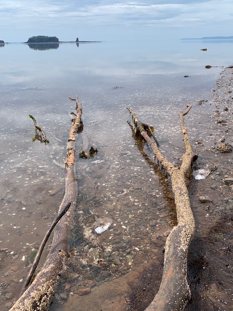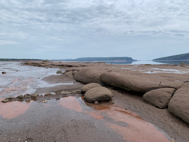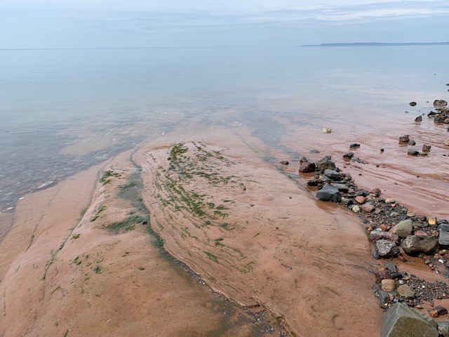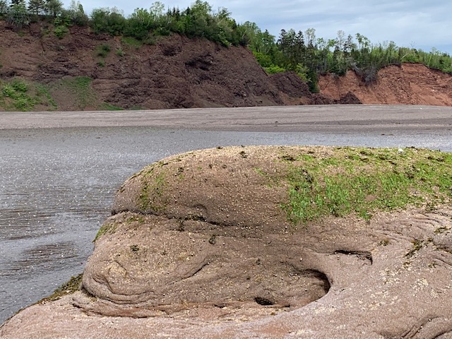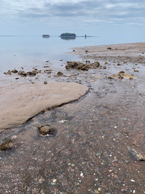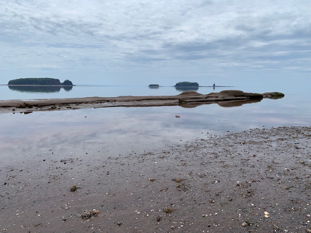 To state that we were a little underwhelmed at that point would be the correct observation. We walked back close to the water. We didn’t need a particular reason to hug the water’s edge but soon realized that the beach here was devoid of blackflies. It also presented us with a spectacular view of the Five Islands as they appeared closer to us with their bases exposed and the light changing to reveal a little blue sky and better definition in the clouds overhead. Even the contrasting colours on the islands was stronger, rich red clay against the green of trees and algae.