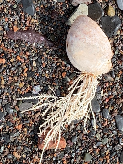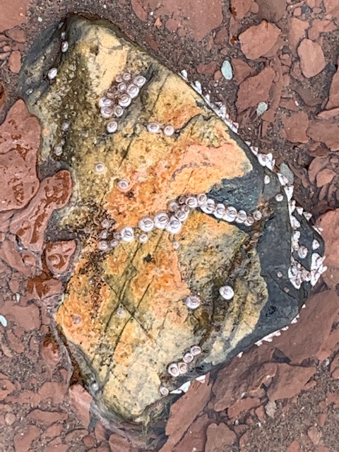 And then we stopped at the same time. We had arrived at a sandy area littered with barnacle-covered rocks, sea weed, kelp, coral and shells. A loon was making its presence known with its haunting call not far from us. Delighted, we continued to give our cameras a good workout. Minutes later I turned toward Five Islands once more and the next discovery nearly made us sprint toward it.