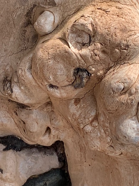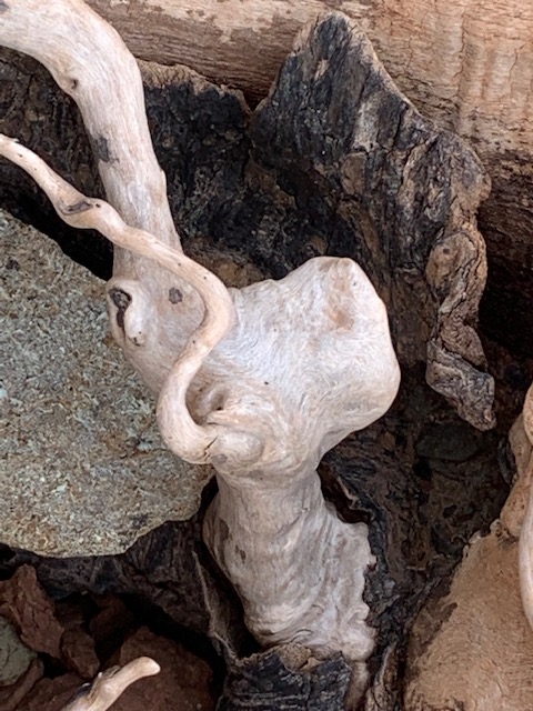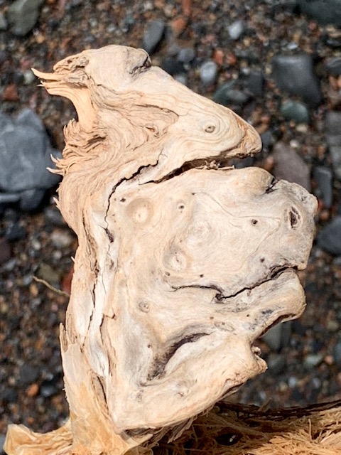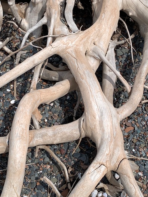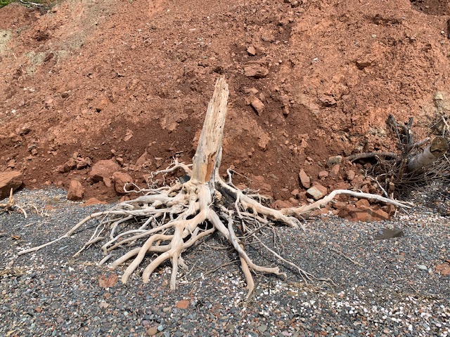 We turned west at the bottom of the road and followed the cliffs on a rocky shoreline that offered some new geological formations as well as driftwood, nature’s most amazing sculptures. Soon we were concentrating on these natural offering through the lenses of our cameras. This was not the first time that we realized that if we just focused on the “gifts” presented expectations would adjust. Witnessing the retreat of the tide to our left, swatting away and doing our utmost to ignore pesky blackflies close to the cliff while constantly adjusting our camera settings, we walked on.