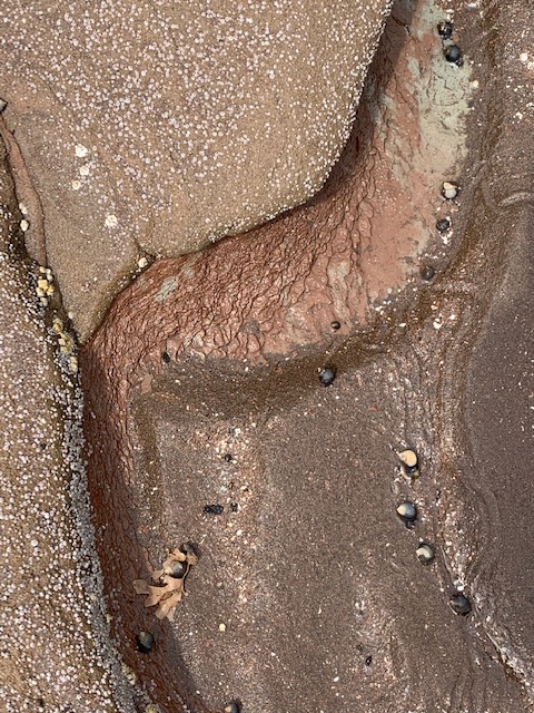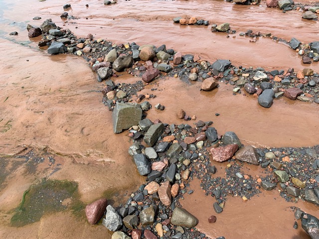 There, stretched out before us was a formation reminiscent of a sandbank. As we approached it quickly we realized that we were looking at sandstone rock. I wish I could share the sound of the water ever so gently lapping against it, the seagulls soaring overhead calling to each other. I will not mention the piercing sound of a couple ATVs with fishermen on their way to the weir to harvest their most recent catch… it’s a sound that signifies productivity… and it soon disappeared into the distance.