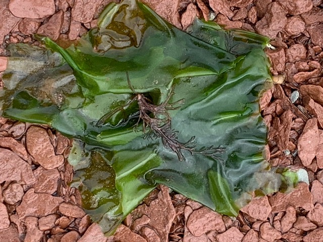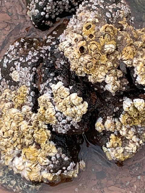 And there it was… a grouping of smooth rocks, covered in the bright green of thick algae and seaweed made us take note and immediately move toward the water’s edge. Ah, finally! Some variety! Our collective mood lifted instantly and the focus shifted to examining the tidal rocks and all they had to offer.