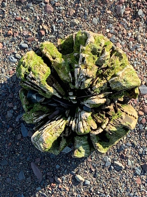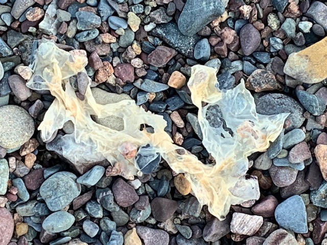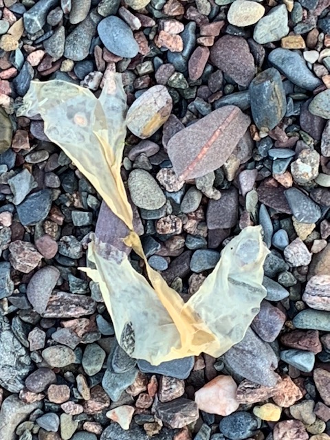 I move into the shaded parts of the beach, closer to a cliff overhang near accumulated driftwood when I come upon these paper-thin bleached kelp remnants. With such diversity in the way they shriveled up while drying I am drawn in and can’t help myself capturing what nature is presenting to me. All I need to do is be receptive and look. I find kelp and seaweed a constant source of inspiration for colour, texture, line and its sculptural properties. This inspiration is spilling over into my studio practice where I am dreaming up new concepts on how to integrate this malleable material into my work. I am just at the sketching stage right now…