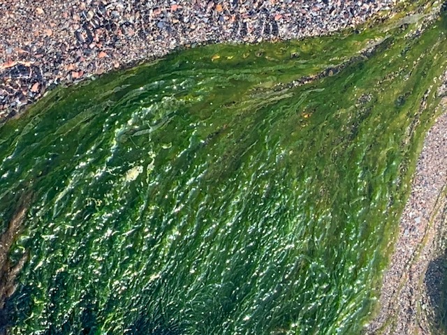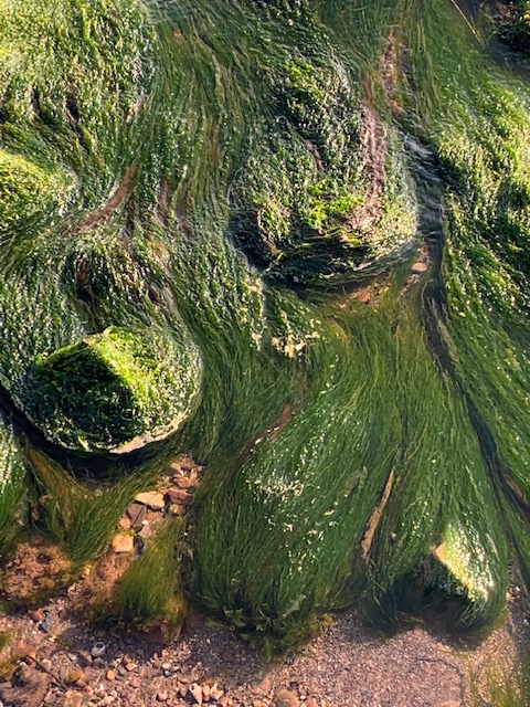 It never ceases to amaze me what treasures I can glean from getting close, kneeling down to examine the standing water. Strands of sea grass gently moving with the water stirred by the breeze, tiny snails hiding between the shaded sanctuary of rocks and the lush green hairlike strings. In the background waves slowly rolling in for the next high tide.
