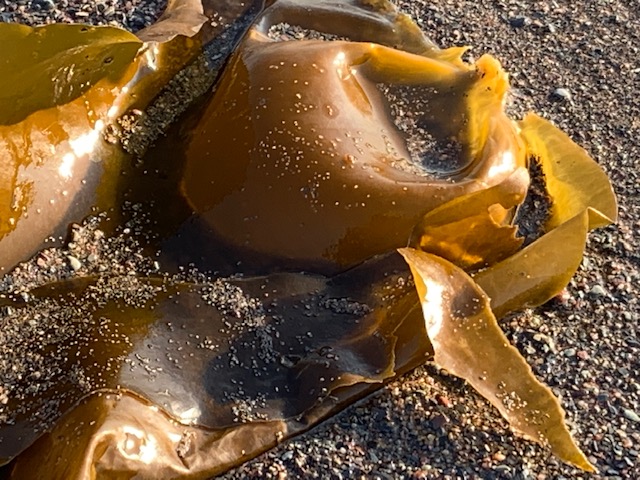 I am not feeling rushed. The sandy beach now spreading in front of me as far as I can see, I focus my attention on the kelp lying in wait for the cooling waves to wash away the grains of sand and eventually sweep it back into the open waters. The sun is at the perfect angle to create captivating patterns of light and shadow. It is a mesmerizing time as I switch back and forth between the macro lens on my camera and my iPhone framing individual images.