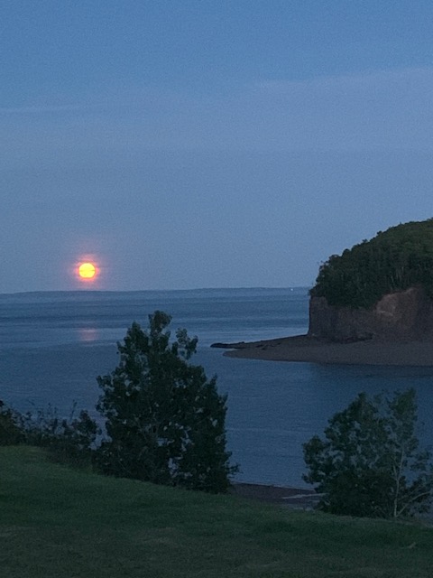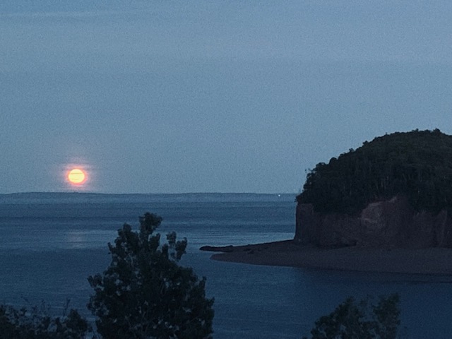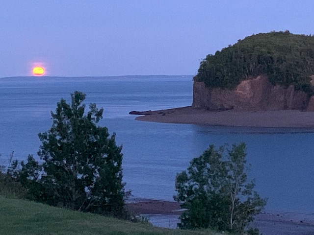 I met the local naturalist during a short afternoon beach walk last Thursday. When he learned that we were fairly new to the area he suggested several places to watch the Strawberry Moon rise. We ended up just above Two Islands with the last sunset glow disappearing in the rear view mirror.
