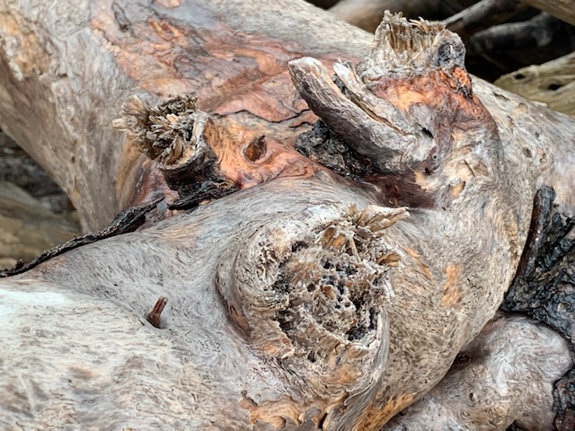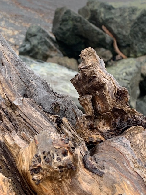 What fantastic driftwood sculptures awaited your perceptive eye Anna, and then your camera lens. So fascinating to see nature’s very own water-polished wood-turnings – a wood-turner’s dream I think. My father would have loved to see these as much as he delighted in discovering ‘wood-secrets’ revealed to him in his own wood-turning workshop. As for the strange ‘creature’ with emergent projections resembling nail heads, do you know what it is? What fascinating things you are finding on aptly-named Driftwood Beach, particularly this evocative little beasts, whatever it is, the likes of which I have never seen before. Thank you.