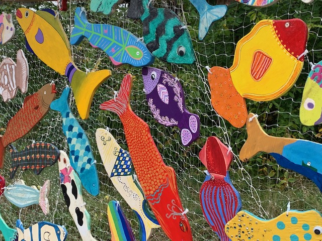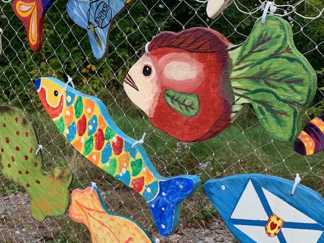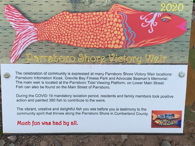 Where Main Street turns into Whitehall in Parrsboro one finds a viewing platform over the former inner harbour. There is plenty of space to park the car and explore. I have finally taken the time to stop and take some pictures of the Parrsboro Victory Weir located next to this viewing platform. The 380 colourful fish were created by the community at large as a Covid19 project. They certainly add a cheerful landmark in our village.