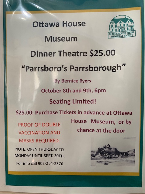 I have had a few busy weeks here but life will soon calm down a little. Parrsboro is nearing the end of its “Ten Days in October” Festival. One of the last events this weekend includes the Ottawa-House-by-the-Sea fundraiser dinner theatre.