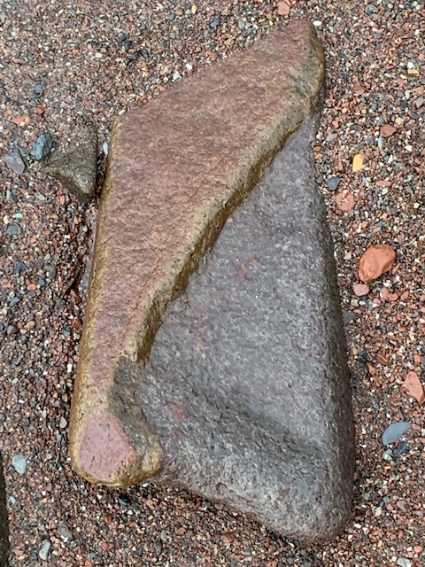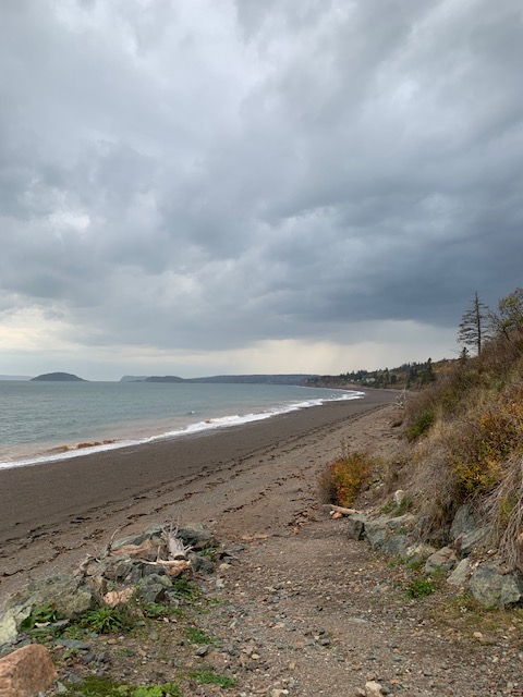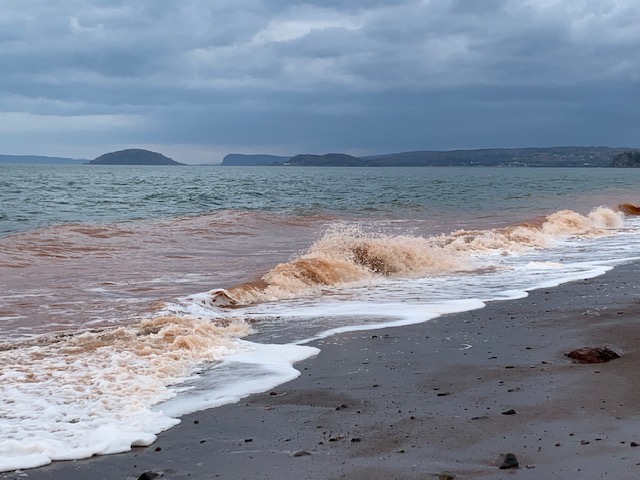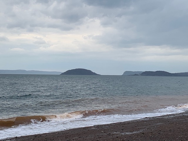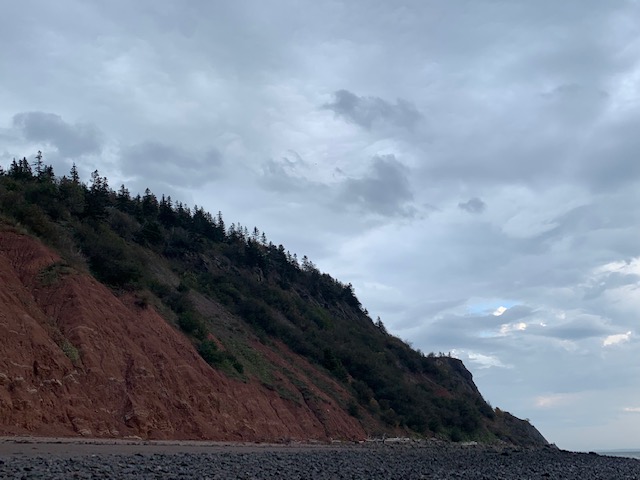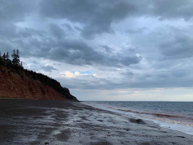 I set out in the direction of Two Islands up shore and I stop at Glooscap Campground. The campground is closed for the season and few people like bending low to slip under the fence. I don’t mind. I love walking toward the sound of waves traveling up the cliff, beckoning me to hurry. Walking down the generous approach to the beach I notice my breathing slowing down. The salty air fills my lungs and my mind clears. My heart beat slows. A deep inhale and exhale: Ahhhh…