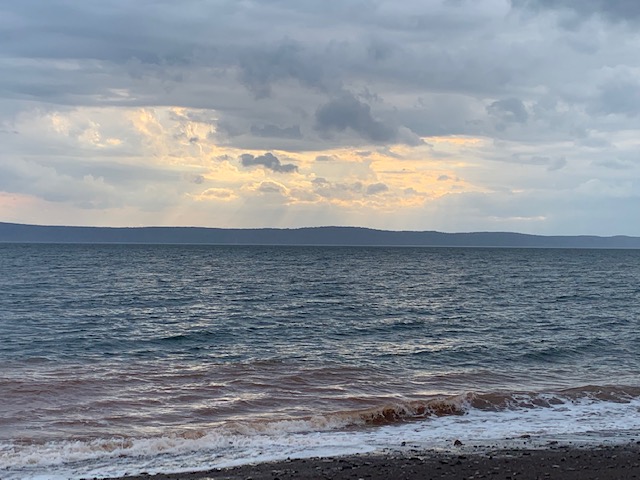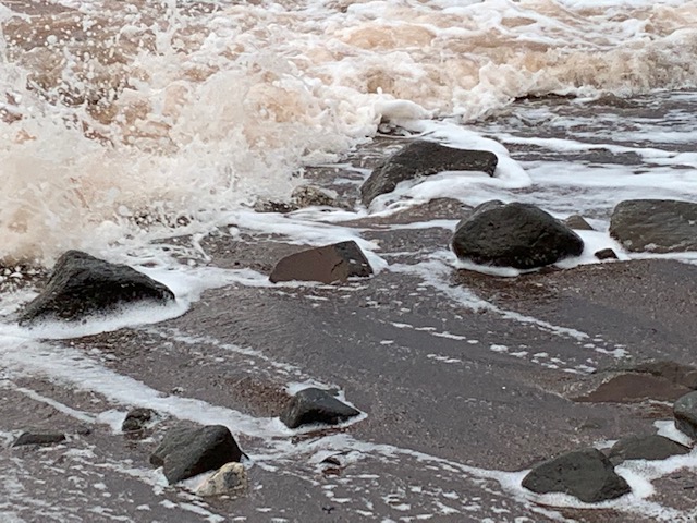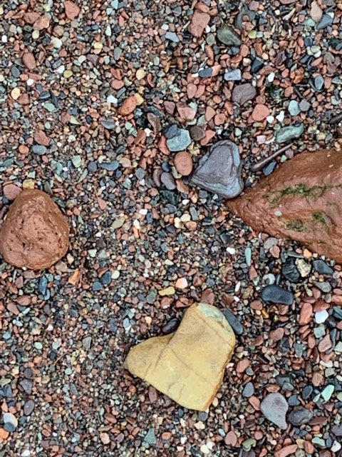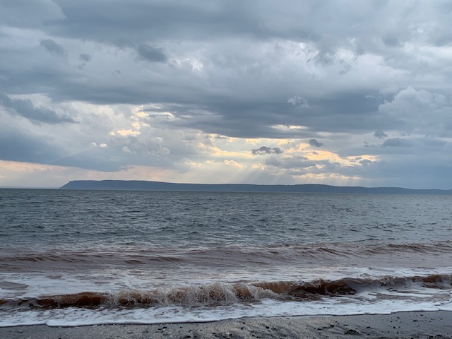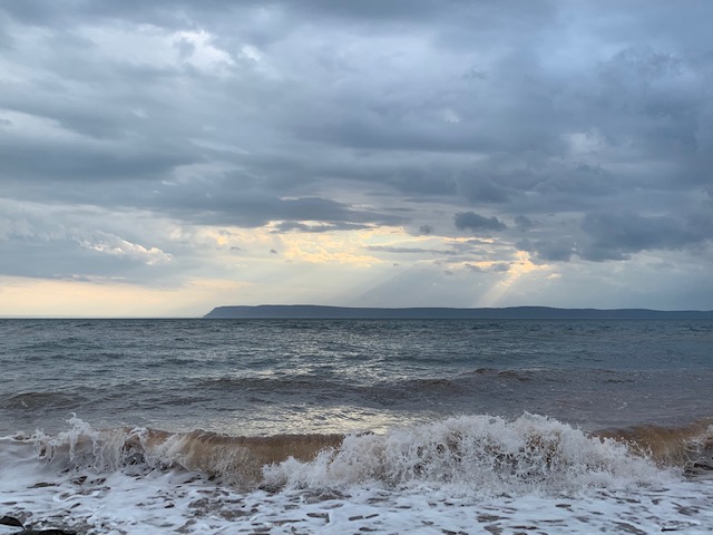 Daylight begins to fade and I drink in those precious moments. There are no voices, no music nor car motors or heavy machinery. As crashing waves make landfall and roll back the occasional squawk from a gull cuts through the air and then, there it is: distant thunder. At first I try to push the familiar sound aside, then I become acutely aware that I am the tallest figure walking the vast beach. I begin to move faster only to get distracted by the coloured pebbles under my feet…