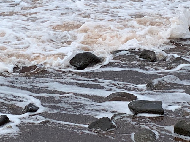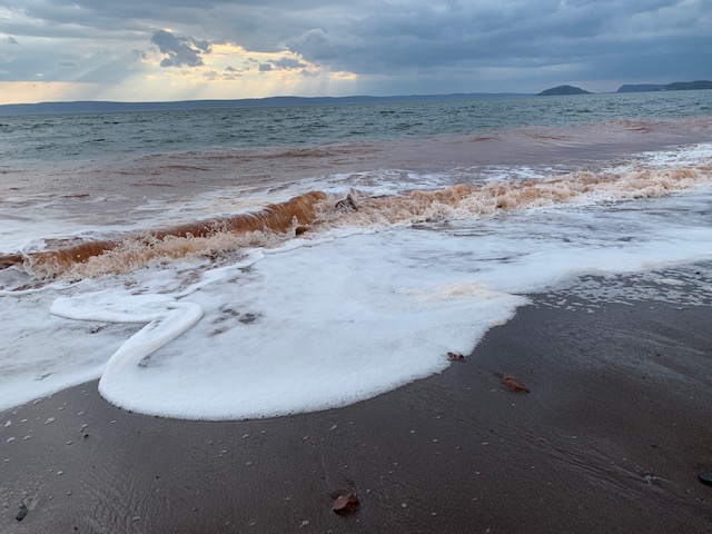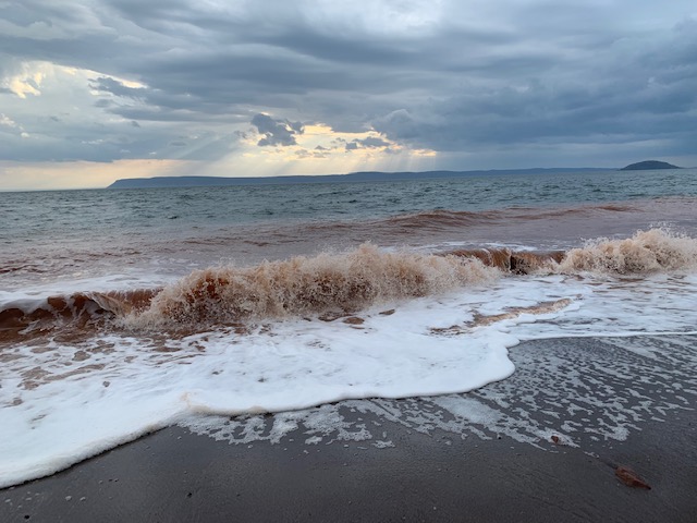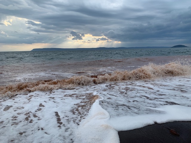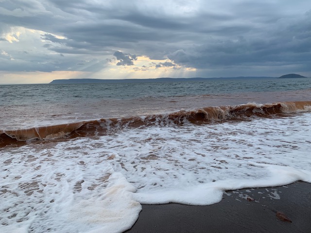 Looking at these images I can still hear the waves crashing, as the red sand is mixing with the water I am reminded of a painting I once saw titled “The Chocolate Wave”. And it all comes together with the cloudy sky filtering a little sunlight near the horizon.