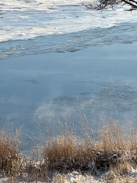 It has warmed up since yesterday and the ice has disappeared completely. The sky is overcast and the light flat. How fortunate was I to capture flowing ice yesterday morning? The light was magical and the frozen slush made the sound of crystal glasses touching when making a toast at a special dinner party.
