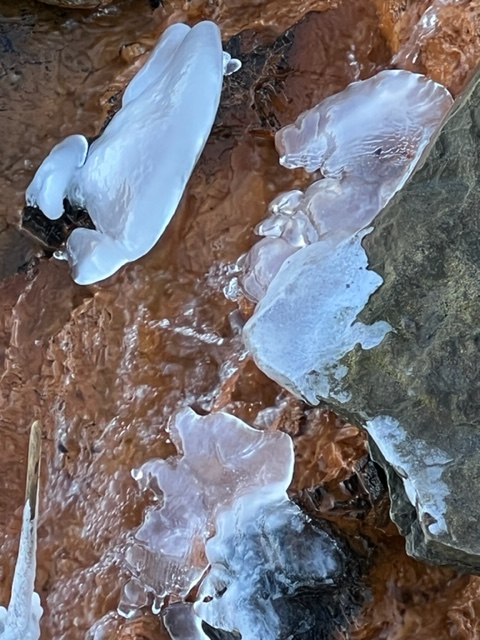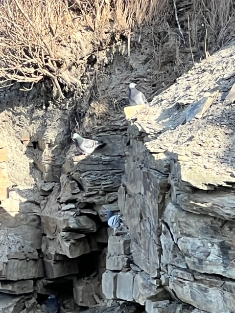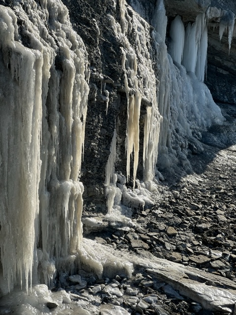 We were only able to get as far as the viewing platform close to the beach. The steps are removed and safely stored out of the elements for winter. The fossil forests eluded us yesterday but we will be returning once winter moves on and geological sites, like Joggins, are more accessible. I captured a few images of the running water oozing from the cliffs to continually erode the red sandstone below… The wall of ice to the right of the viewing platform was equally impressive. Two pigeons appeared out of place as they were exploring the layered rocks nearby.