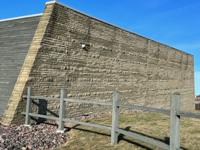 Last year the Fossil Centre was closed due to the pandemic, this year the centre was closed because of the winter season. Not much remains open once tourist season is over. I love the interpretive centre with its clean lines and shadows its casts with the sun just at the right angle. We parked the car and navigated our way through the green space, past the meditation spiral toward the stairs.