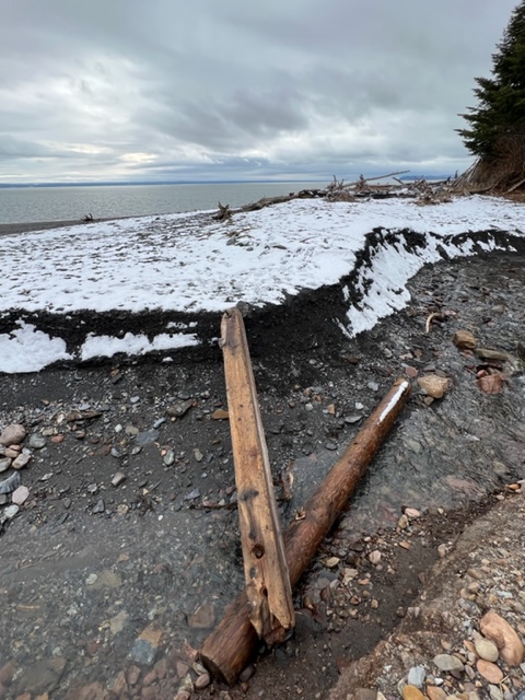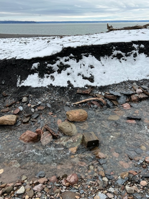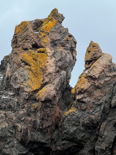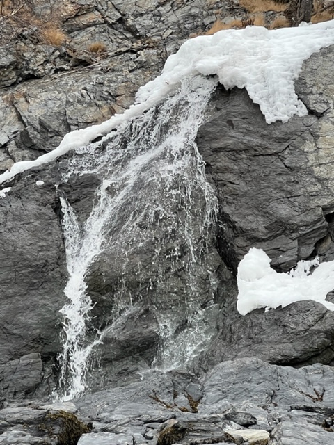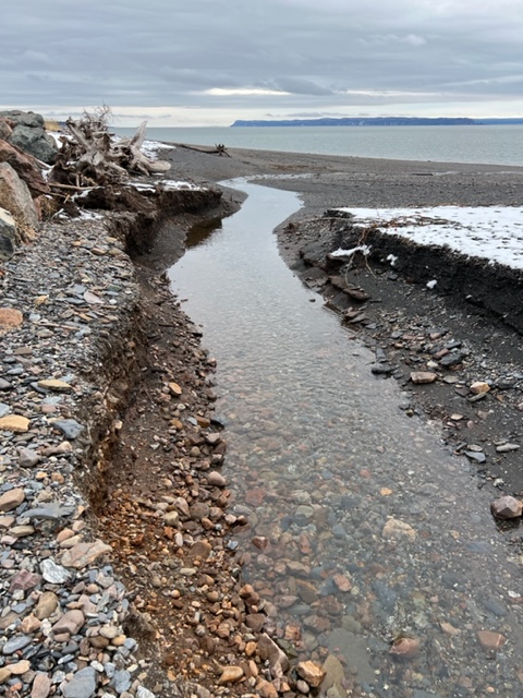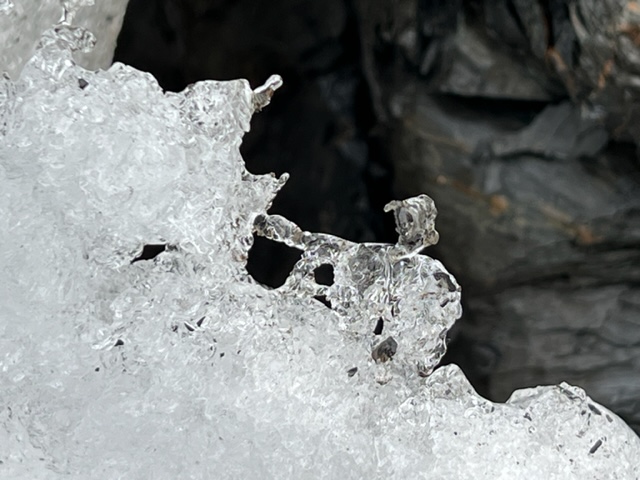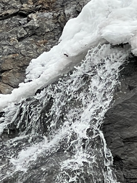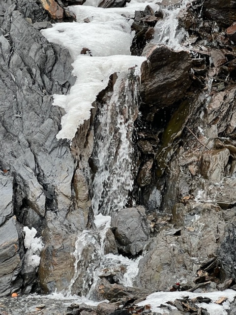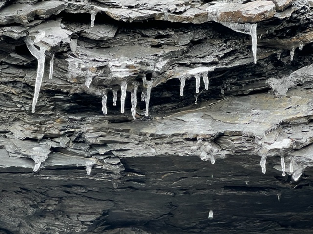 Small waterfalls along the cliffs are another source of inspiration. It was above freezing and the water was rushing off the smooth rock faces toward the ground providing an additional layer of sound to the concert already provided by the calls of gulls and crows against the gentle waves lapping at the pebble shore.