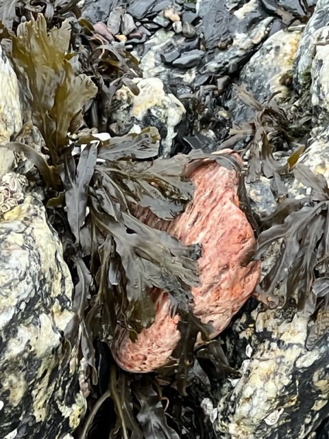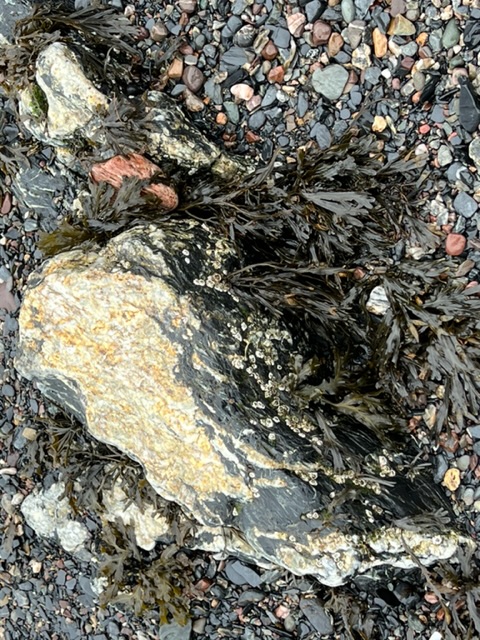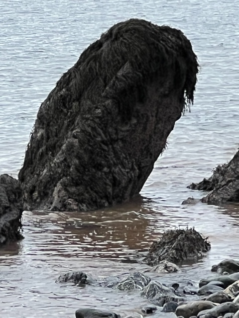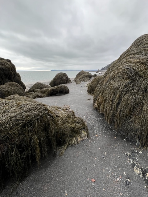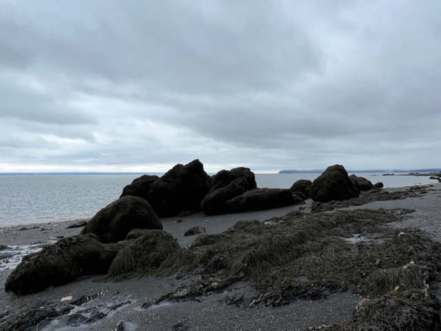 The receding tide revealed seaweed-covered rocks along the shore which reminded me of ancient sea creatures slowly making their way to land…