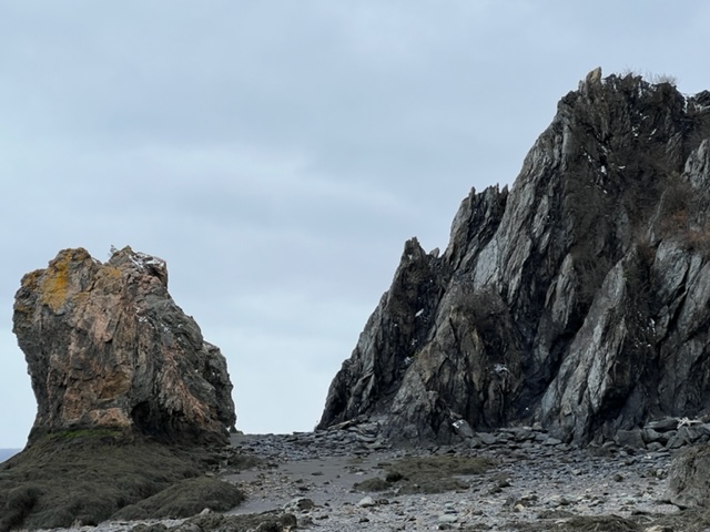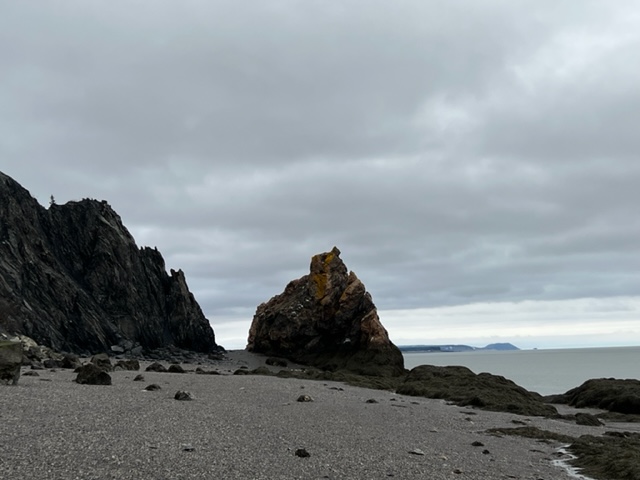 I was nearing the two-hour mark on my walk and I noticed the light was beginning to fade a little. At this time I looked on to see what the beach ahead of me would hold. I was very pleased to recognize the familiar sea stacks of Phinney Green Beach. The first time I visited Wards Brook Beach I tried to orient myself and asked my walking group companion if this beach connects with Phinney Green. I was told that technically it does but the distance was too great to walk to Phinney Green. Imagine my delight in discovering that indeed one could walk from Wards Brook Beach to Phinney Green. It would all depend on the timing of the hike…