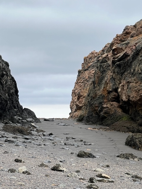 …but the main attractions for me are the rugged sea stacks that beckon from the distance. It was the point where last year’s walking group stopped to survey the area and turn around. This time I had timed my visit to ensure that the tide would not be surprising me too soon and force an early return to the car. Instead, I ventured past the sea stack to my left, the cliff to my right across the large slabs of black rocks and onto the sandy ocean floor.