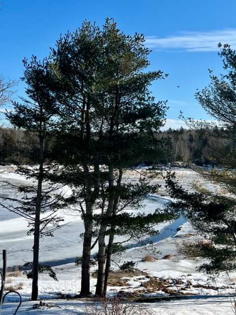 The high tide yesterday flooded the area beyond our backyard yesterday creating a vast ice-covered area with a small crack for the water to flow. This winter is so different from last year’s and I have the best view from the living room to contrast and compare the two winters in Parrsboro.