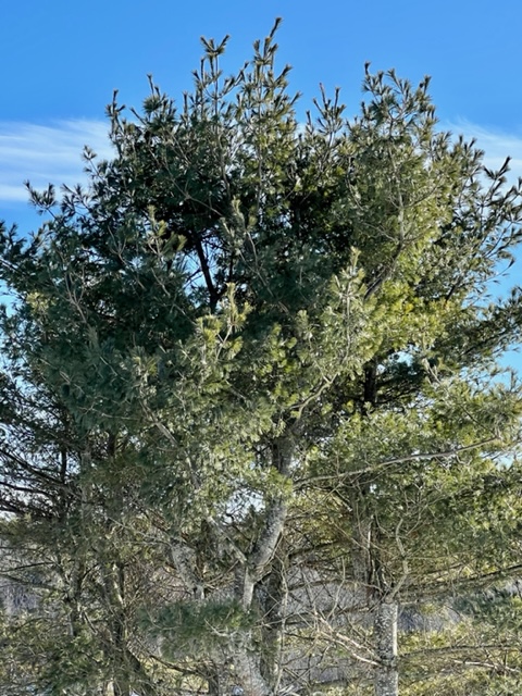 Meanwhile, it has warmed up to -14C and when I stepped outside I could not feel the wind immediately. Standing in the bright sunshine I detected an unusual sound. Looking around I realized it stemmed from the tree and its reaction to the slight breeze. It sounded like thin layers of ice breaking up on a lake due to wind action.