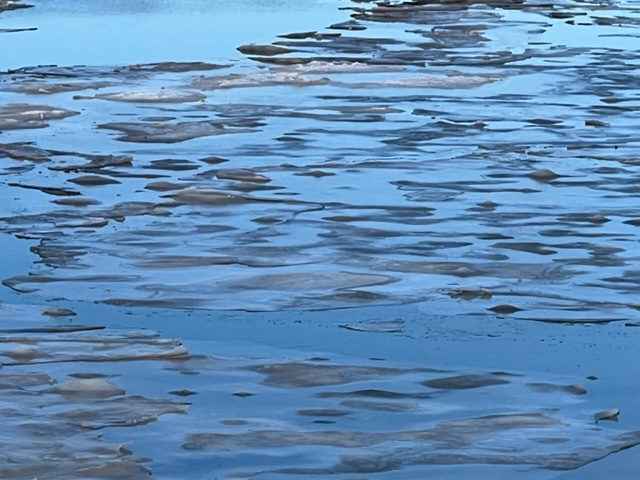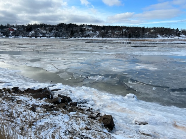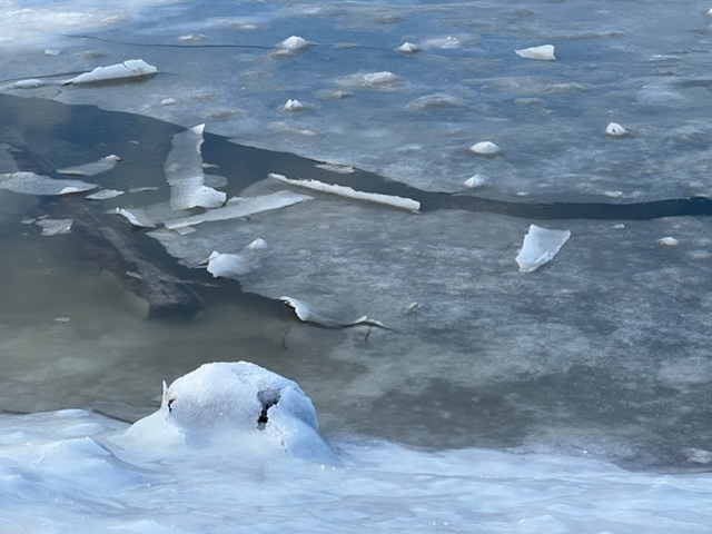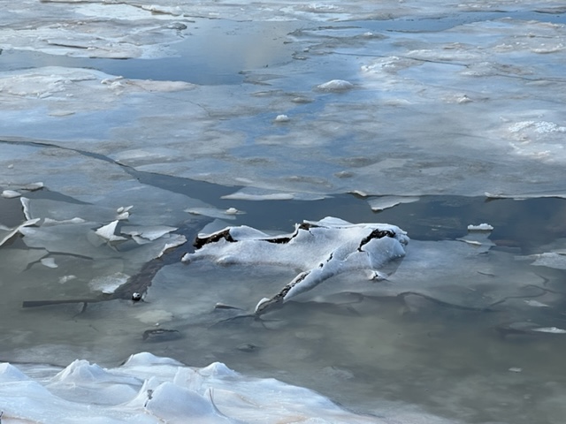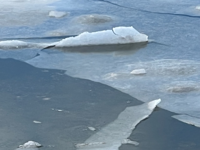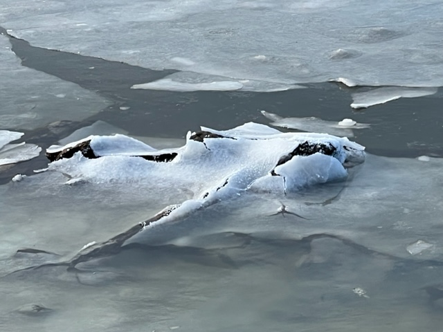 To reach First Beach I walk along the Aboiteau and parts of the Parrsboro Inner Harbour. I understand that this year’s temperatures are comparatively lower than during the past few years. I can’t get enough of the bulging formations, cracks and ice floes. Combined with the blue sky reflections many of the images could easily be interpreted as paintings.