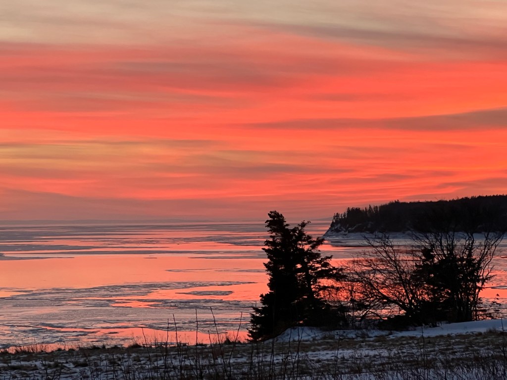 We were on our way home after two long days in Halifax for medical appointments yesterday. As we turned off the highway at Masstown the golden sun was nearing the horizon illuminating the exposed wet and icy ocean floor of the Bay of Fundy making it sparkle and reflect, a sight to be seen!