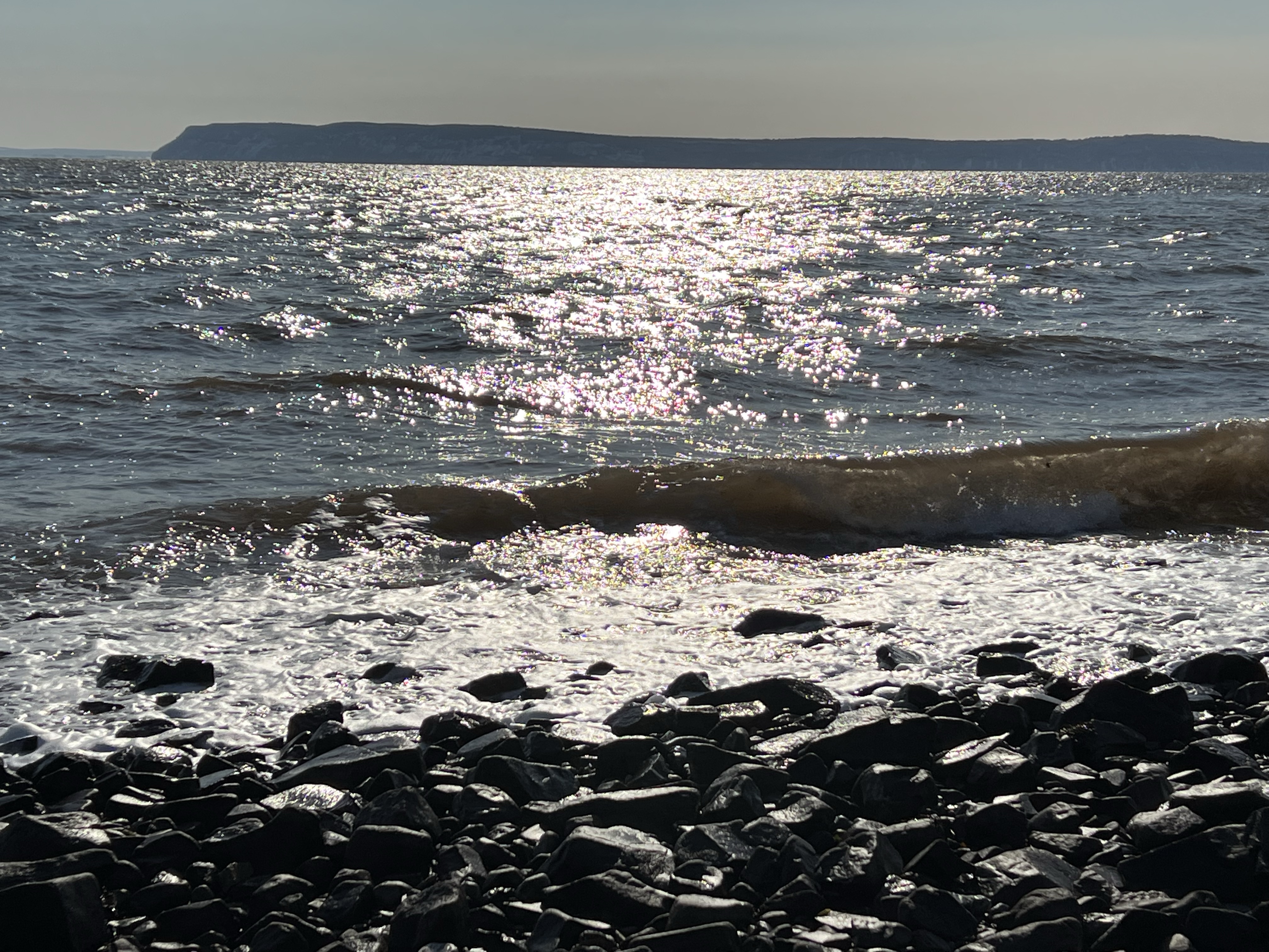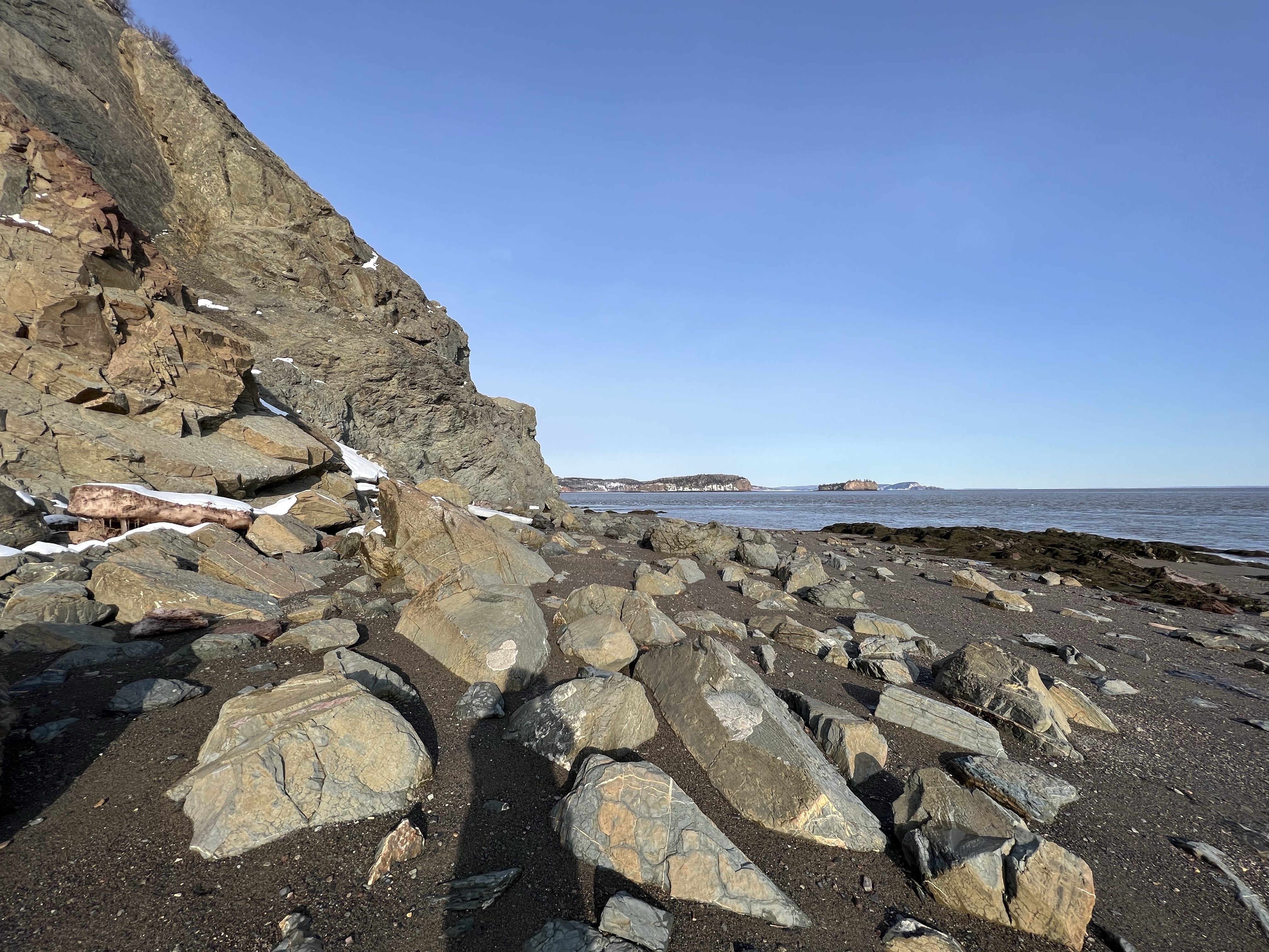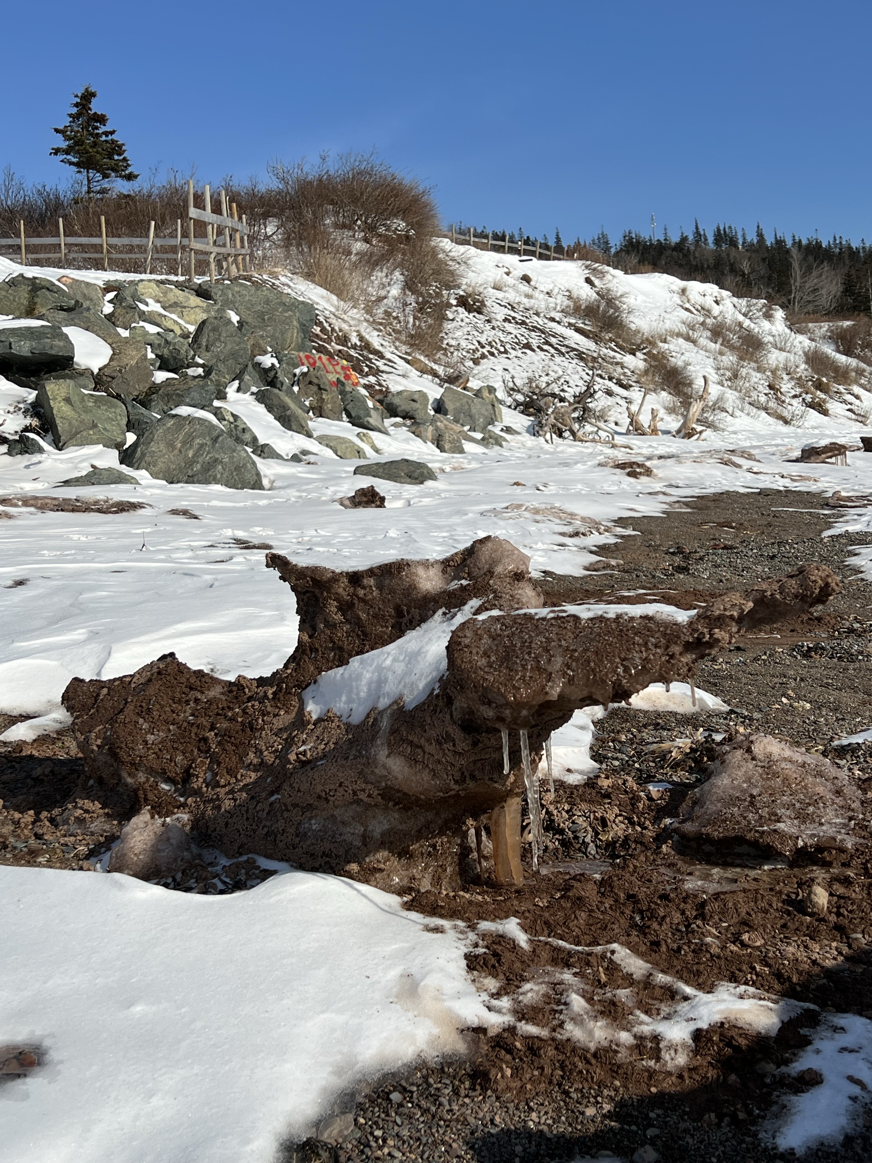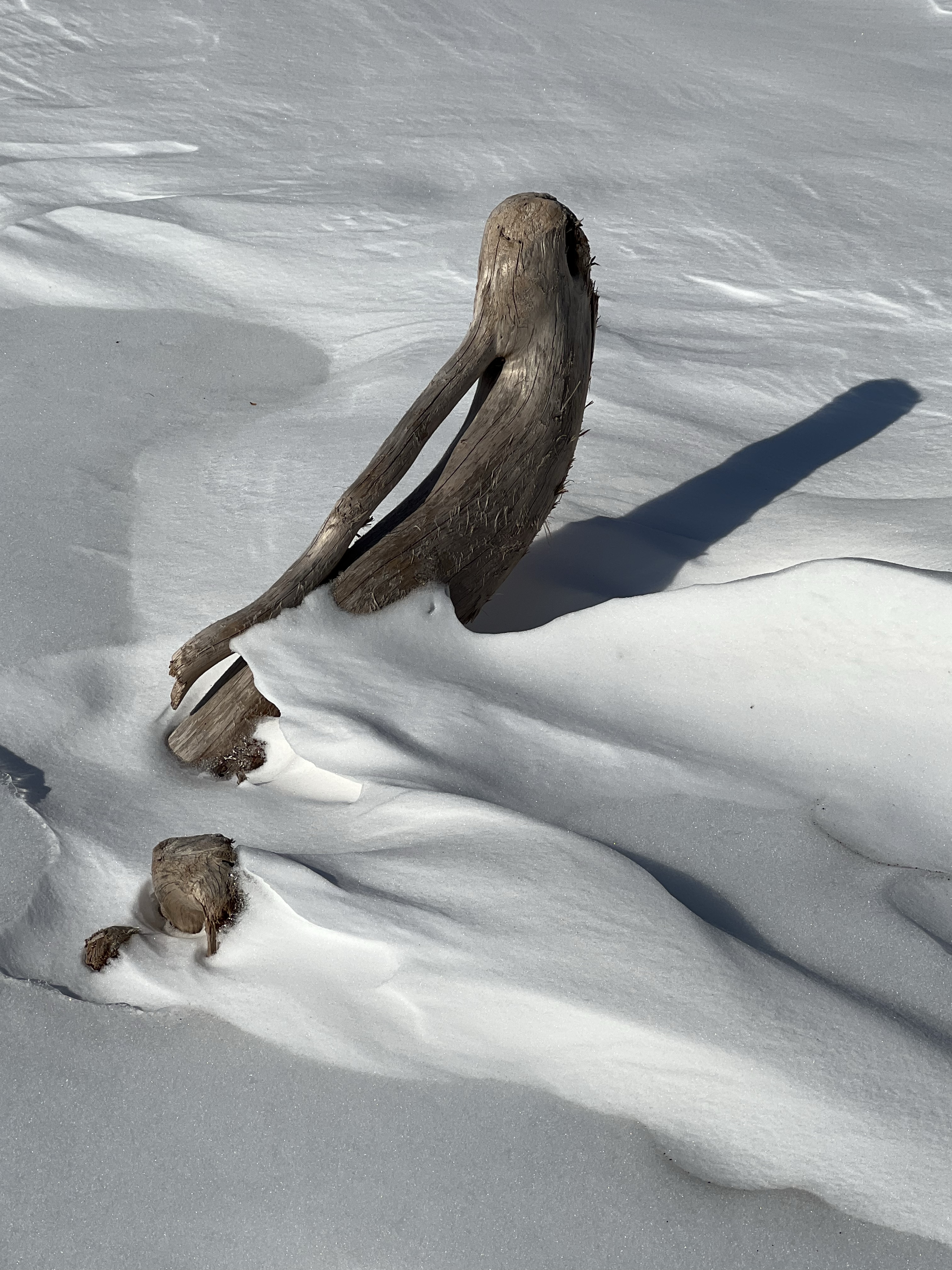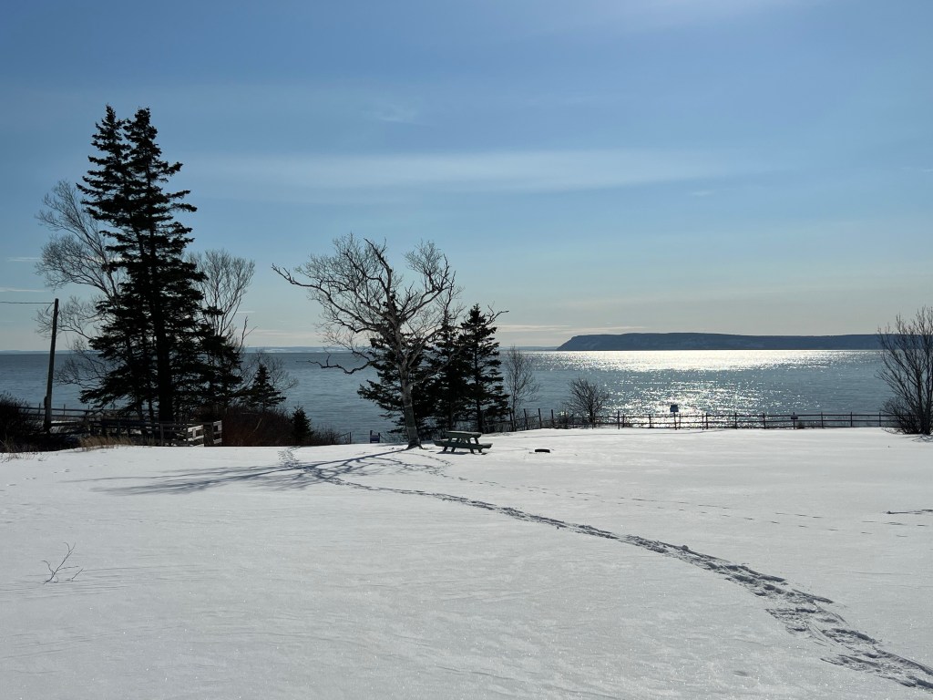 I snowshoed from the gate of Glooscap Campground all the way down to the beach. I love the spot I featured above: it is always awe-inspiring and Feb. 16th, 2022 did not disappoint: the blue sky over the sparkling Bay of Fundy waters and white snow were beckoning.