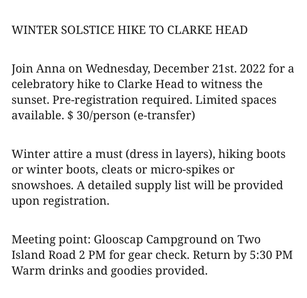 What are YOU doing on December 21st, otherwise known as Winter Solstice? I am planning a special sunset hike to Clarke Head at low tide. Here is the preliminary information: