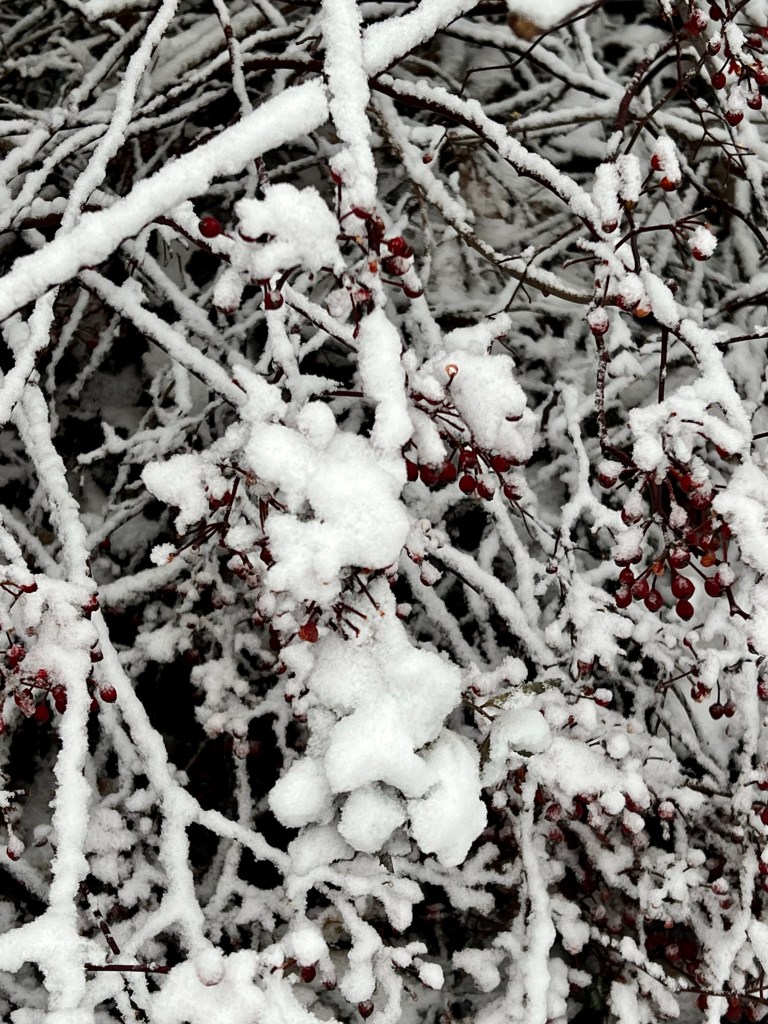 The weather turned over night… and we were greeted by fluffy white stuff, otherwise known as snow, covering the yard.