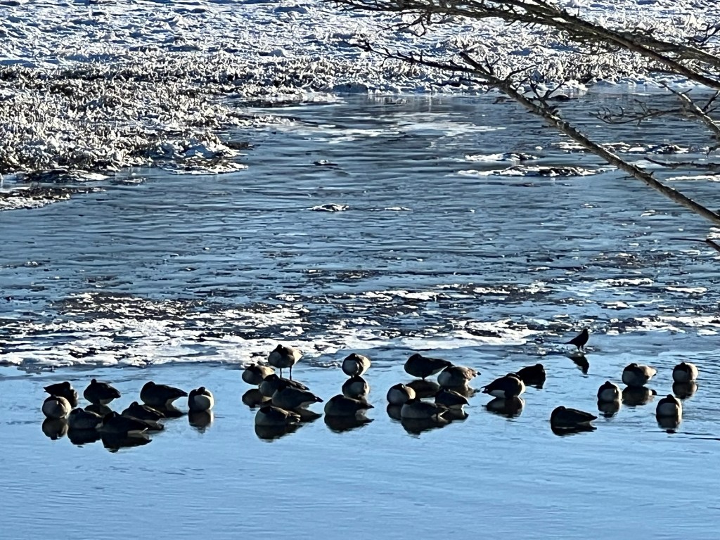 And the Canada Geese appeared frozen to the ground. Every once in a while there was some gentle chatter between family groups but everyone did their best to preserve body heat. By the time I cleared the snow from the driveway and decks the geese were up and about on the water.