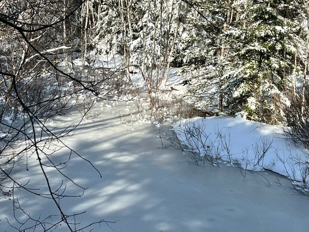 Next find a snow covered area and practice getting up from a fall. You will fall! Don’t expect never to make contact with the ground. The sooner you know how to upright yourself, the better. Poles will be your best friend as you use them to pull yourself up. Avoid icy sections as pictured in the image above. Snowshoes have substantial cleats but caution is still advised when crossing icy areas. It’s easy to loose control without somewhere to firmly plant your poles. Give yourself time to build skills and confidence.