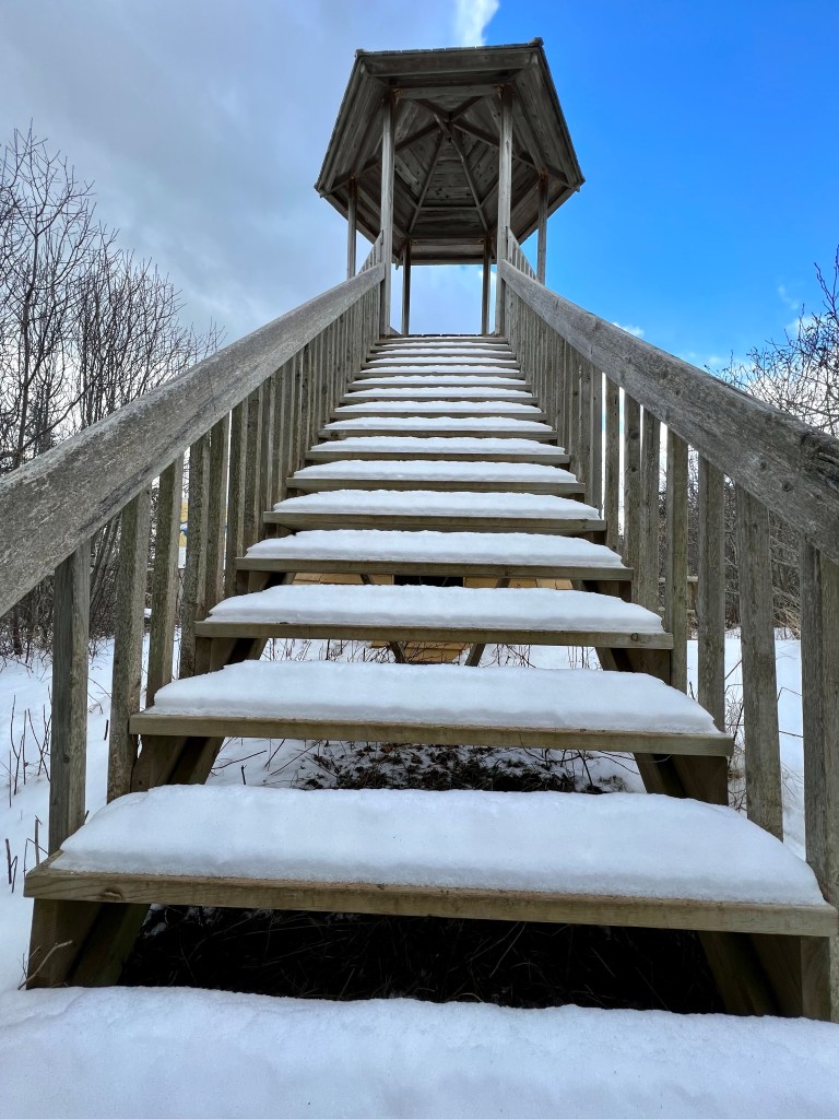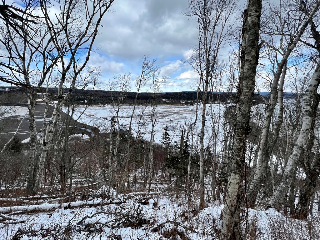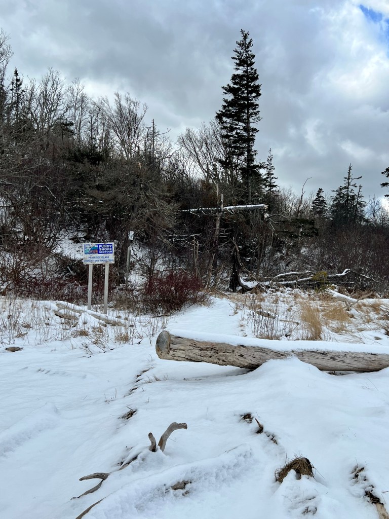 Avid hikers and cardio junkies will welcome the initial steep ascent. This trail eventually levels out and descents toward the look-off tower. I would label the Partridge Island Eco Trail Loop as moderate in difficulty. Sturdy footwear is necessary to safely navigate the uneven terrain. Due to the snow covered unbroken trail I slowed my pace, stopped for photographs along the way and allowed for one hour to complete the hike.