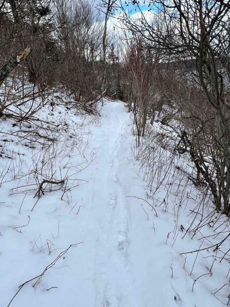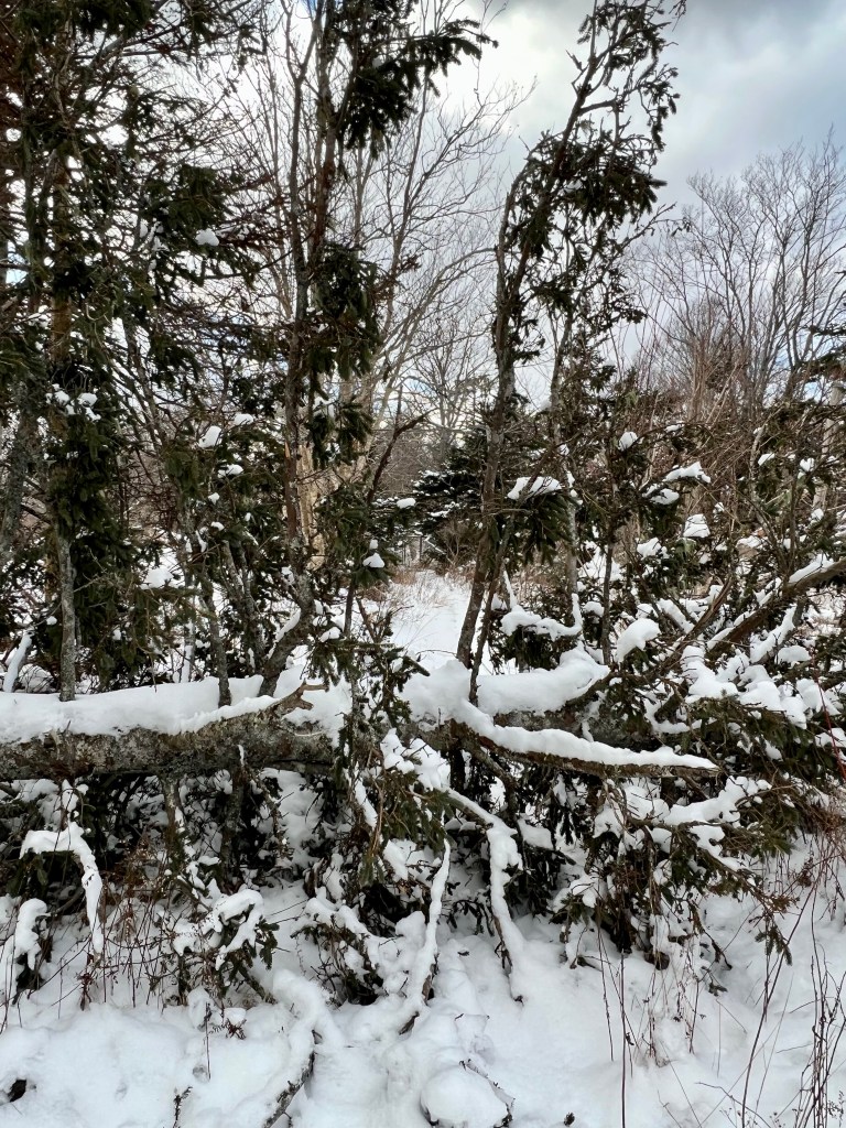 It was an eye-opener today to see so many downed trees as I ascended the snow-covered trail. I was grateful for the trekking poles I grabbed at the last minute and wish I had brought my crampons as they would have provided additional traction. Lesson learned! I navigated the trail without any slips or falls.
