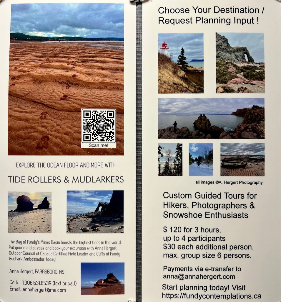 It’s official! I took the plunge, the business name Tide Roller & Mudlarkers was registered as a business in Nova Scotia recently and I am gearing up for a bush tourist season. My rack cards are here and will be distributed shortly.