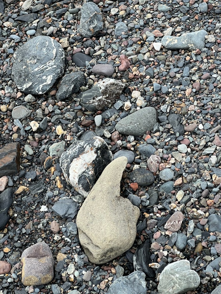 I rarely meet anyone along this beach and today was another quiet day. A lone eagle circled overhead but our eyes were fixed on reaching the basalt formation that is part of the Fundy shore between Five Islands and Cape d’Or.
