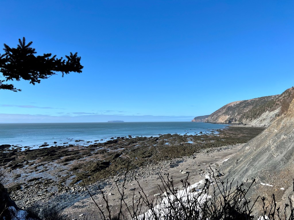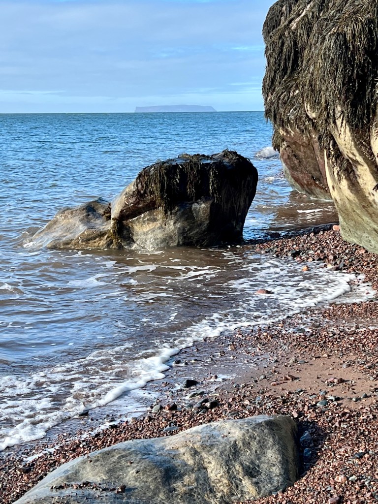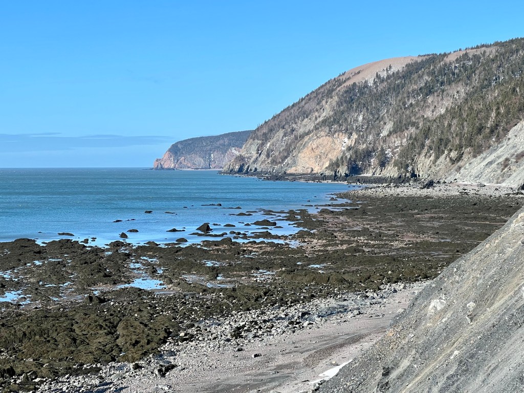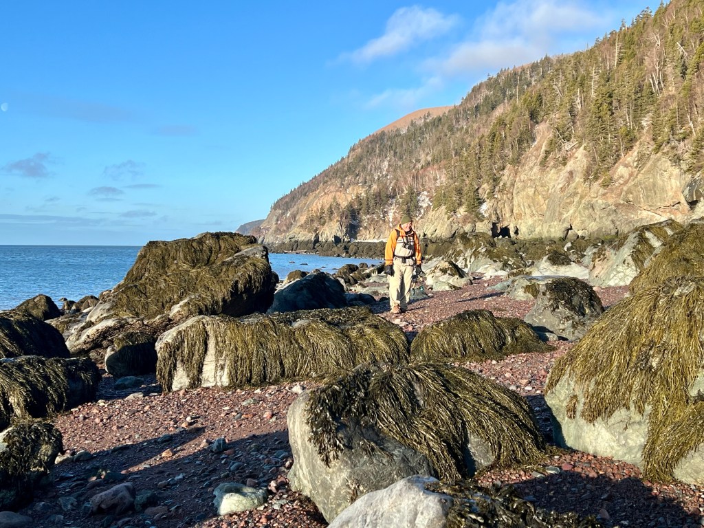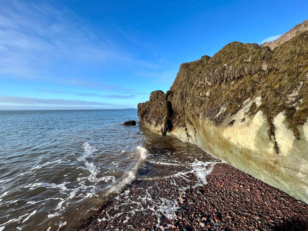 The plan was to hike along the beach from Red Rocks to Refugee Cove, depending on the cooperation of the tide. Well, let’s just say “The Mistress of the Bay”, as my friend calls the Bay of Fundy tide, was not in the mood for a waltz or Foxtrott today. We made good time to the first pinch point where we patiently waited but never got a chance to pass. Making safety our priority we reassessed our hiking plan and decided to proceed to Plan B.