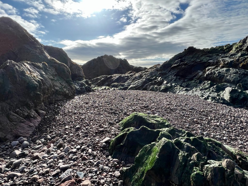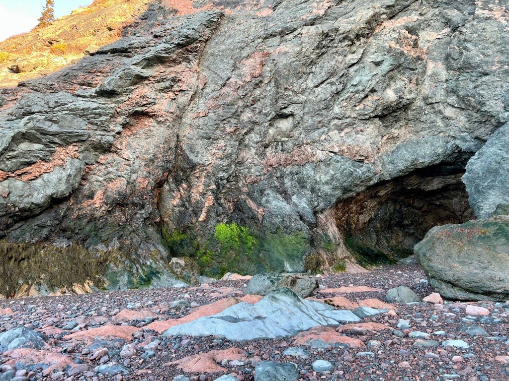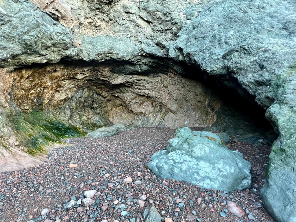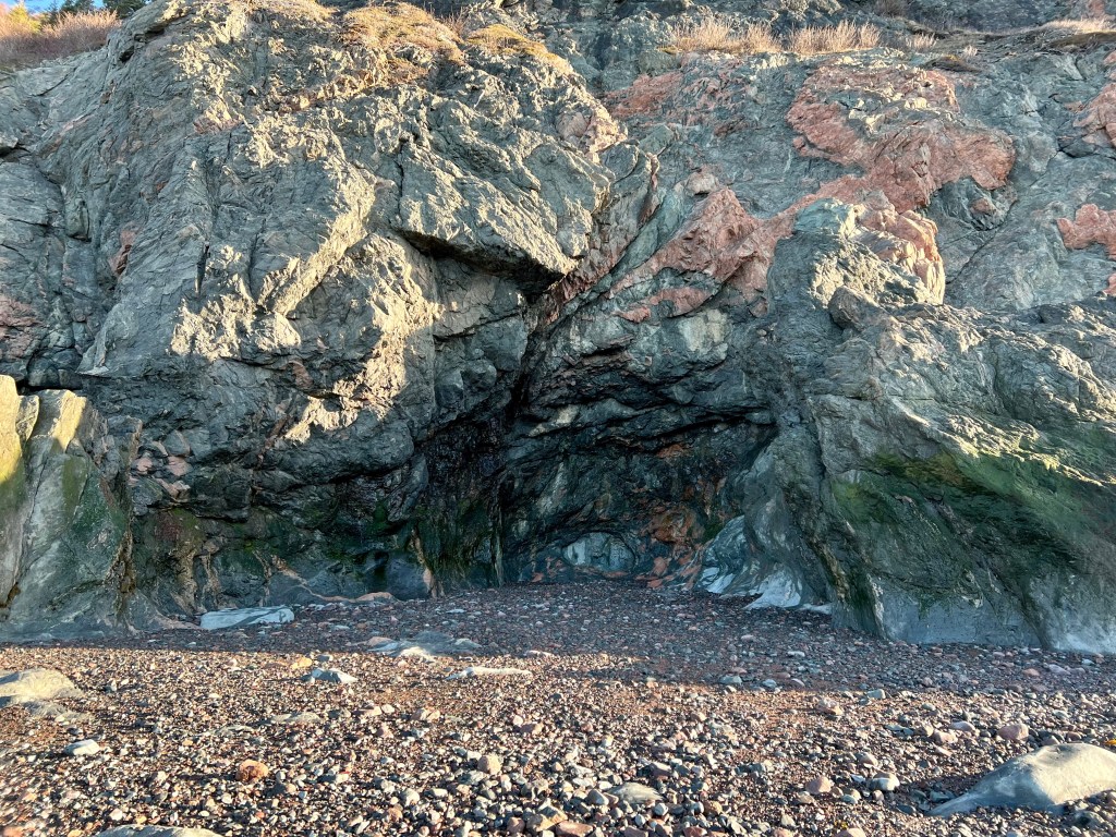 “Mermaid’s Cave” was barely recognizable! The relentless tides and wind had completely transformed the formerly sandy beach into a field of rubble. Large pebbles were piled up high and we had to climb up into the cave to explore.