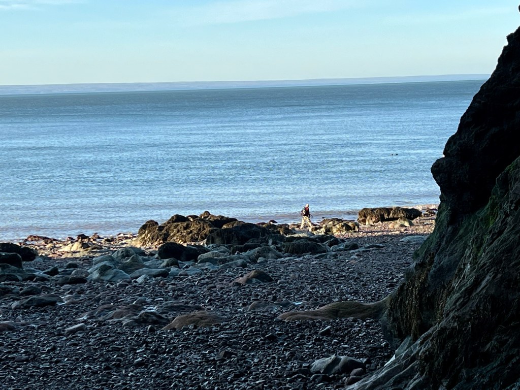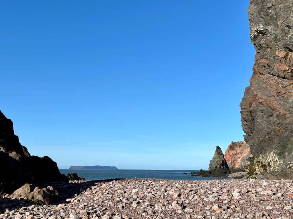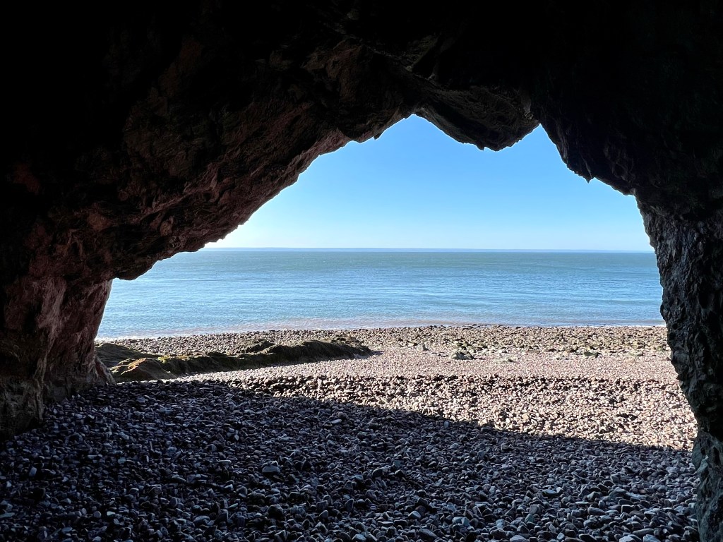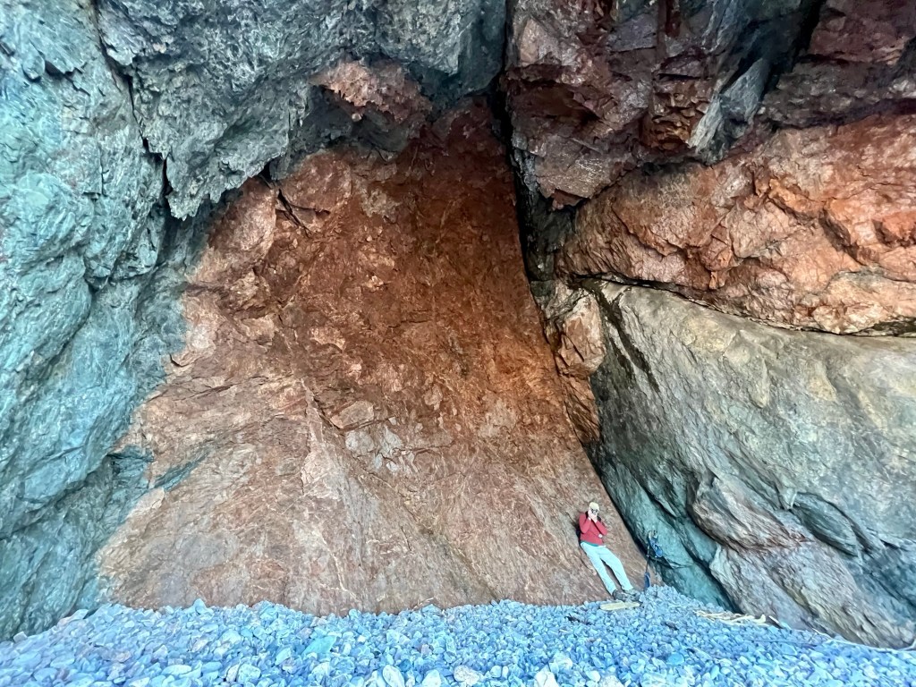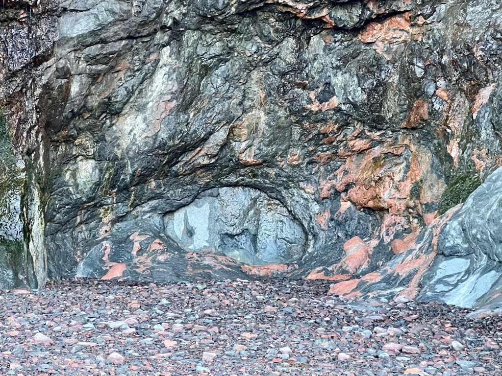 “Mermaid’s Cave” was barely recognizable! The relentless tides and wind had completely transformed the formerly sandy beach into a field of rubble. Large pebbles were piled up high and we had to climb up into the cave to explore.