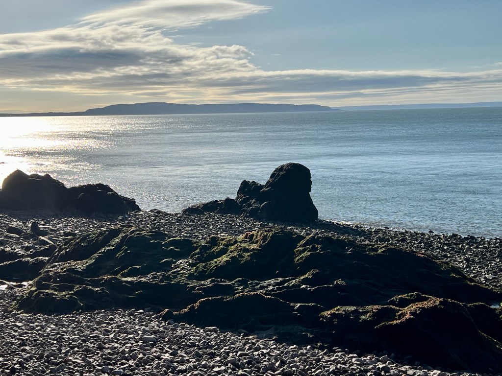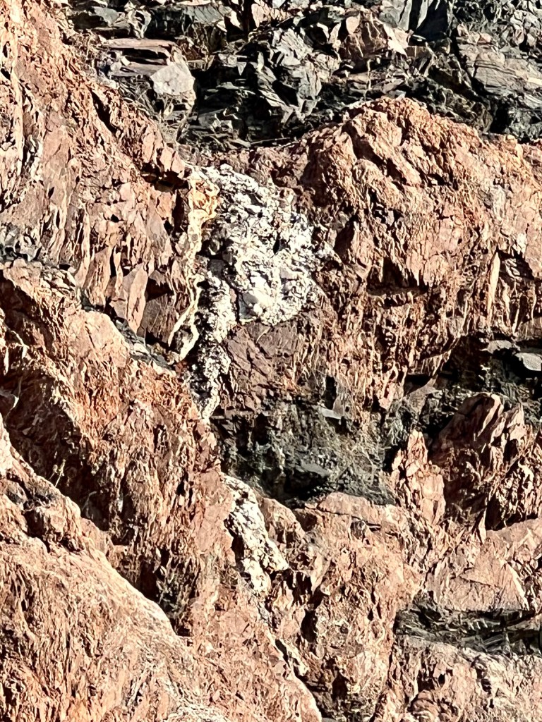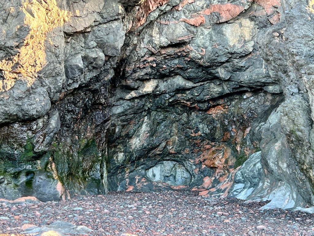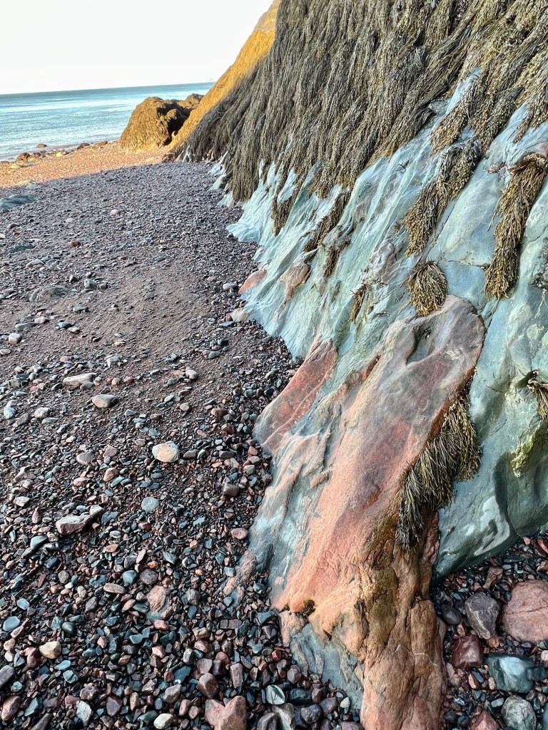 Scrambling over rocky beach terrain I was grateful for my trusty hiking boots. We came upon another discovery high up. By the way the light refracted we determined it to be a Quartz seam.