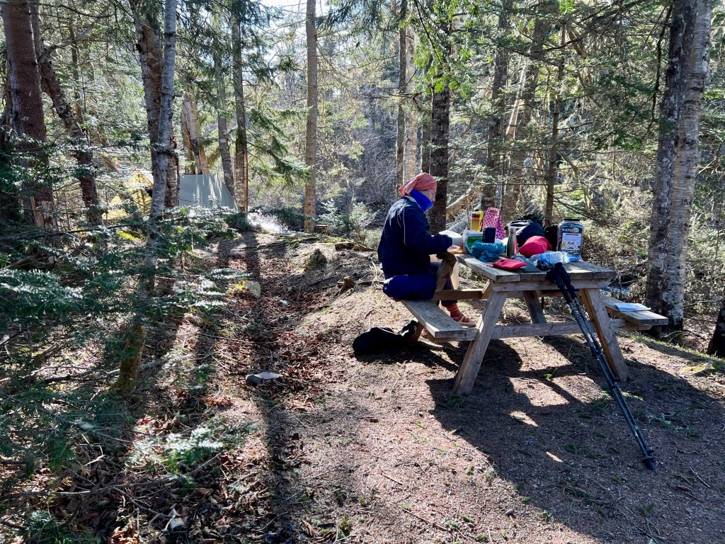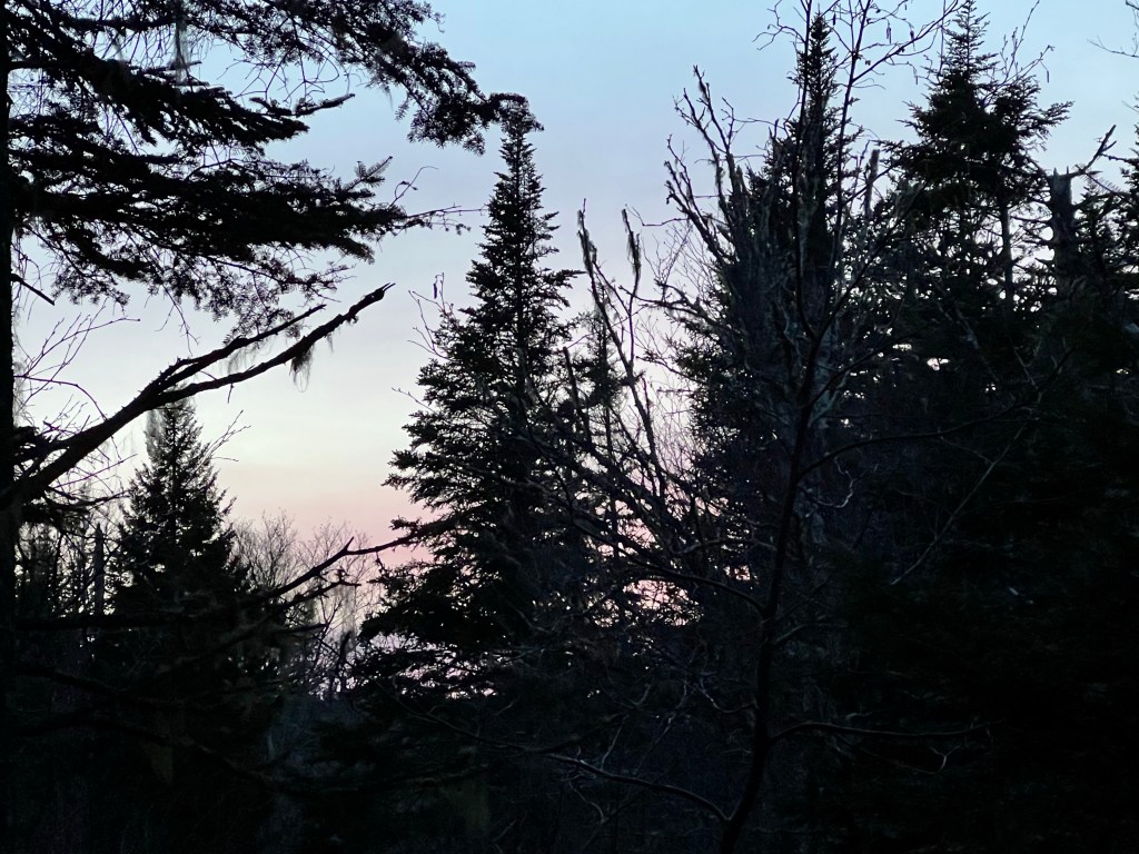 There was some worry about squirrels, mice and bears, so we did our best to suspend food supplies from a rope. Sunset treated us to soft pink skies through the trees… a full moon was rising and the temperature dropped well below freezing.😏