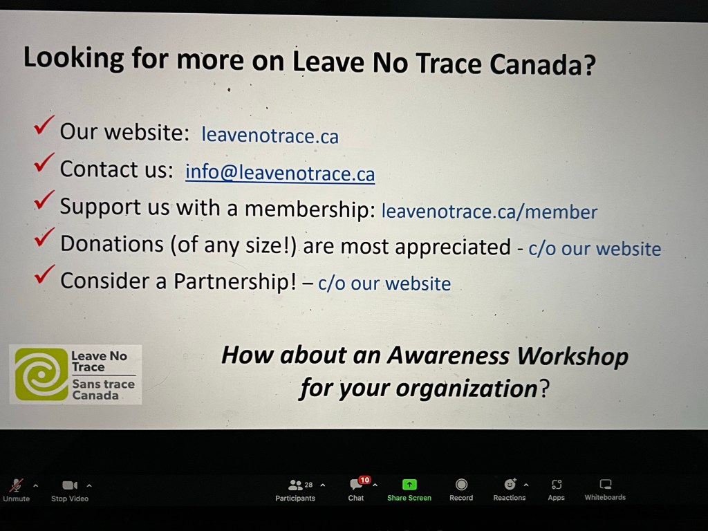 Yesterday evening I had the opportunity to participate in an online seminar centred around the Seven Leave no Trace Principles offered by the Outdoor Council of Canada. The hour long presentation was one of the more enjoyable workshops I have attended via Zoom.