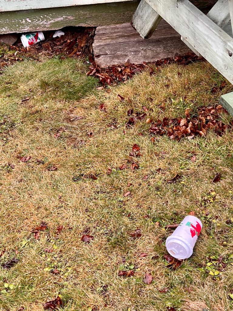 I hope that whoever enjoyed their tea or coffee and cigarillos at this picnic bench over the holidays felt it was worth it! What makes it so difficult to carry out empty cups when they managed just fine hauling them in full for 200 m? Imagine visiting friends and just dropping cigarillo buts and empty take out cups on your friends’ living room floor…
