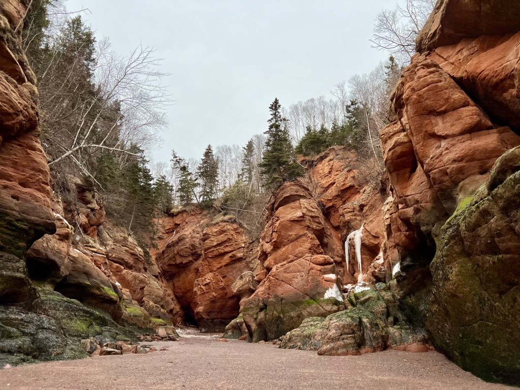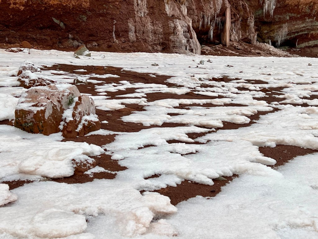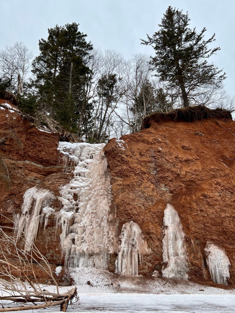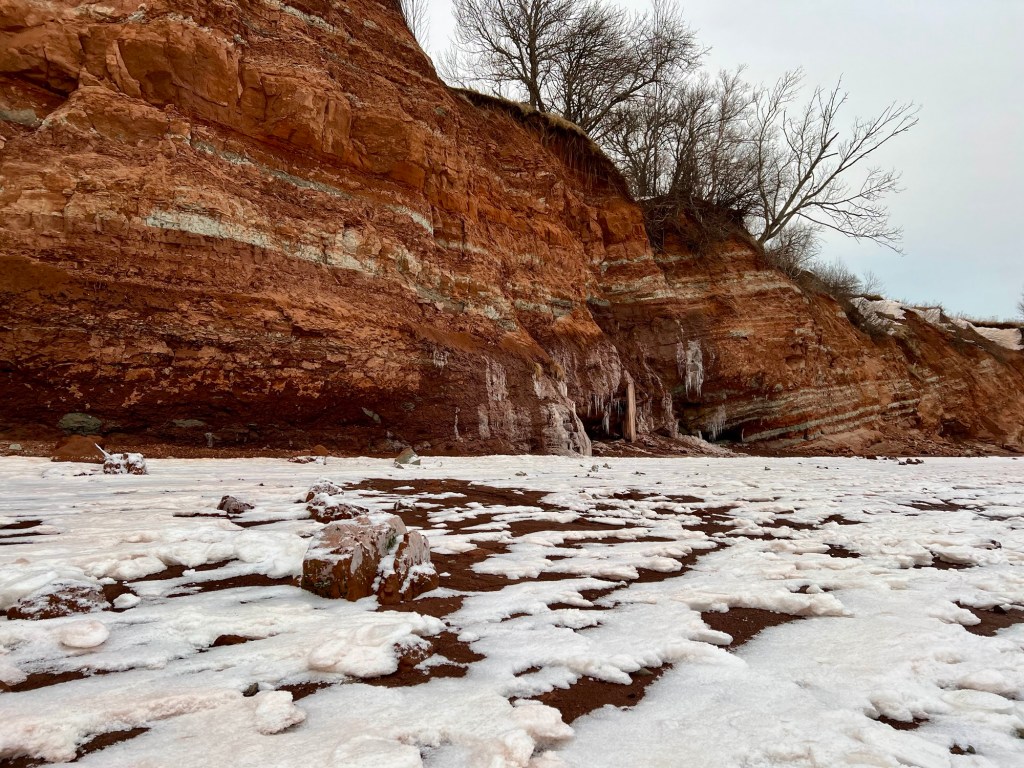 The sky was overcast and the diffused sunlight showcased the red sandstone cliffs to their best advantage. With long icicles contrasting the distinctive rust coloured cliffs shaped by water and wind this stretch of beach was perfect for a first time visitor.