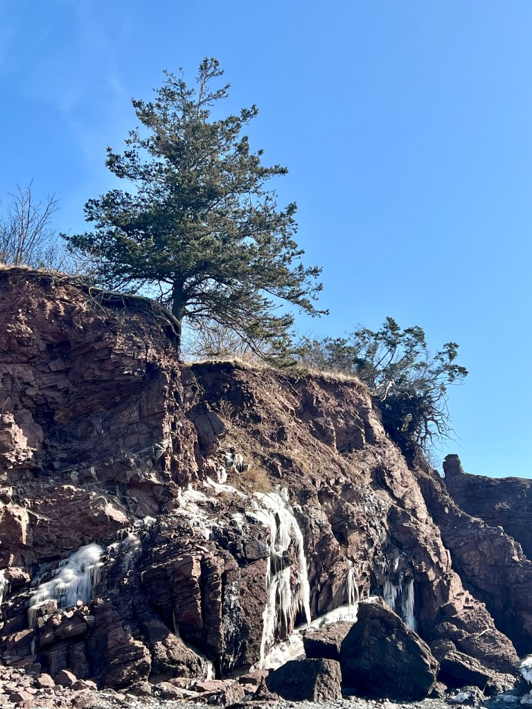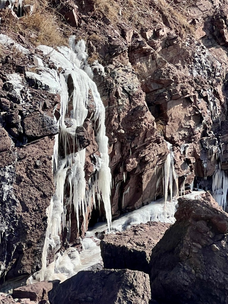 Our Saturday morning walk led to the beach. It has been a while since I walked from Parrsboro’s First Beach to the beach below Glooscap Campground. The wind held off and the cliffs glowed in the morning sun illuminating the icicles oozing from the rocks.