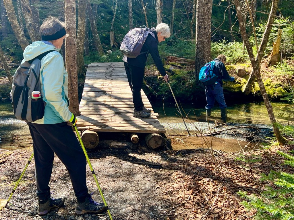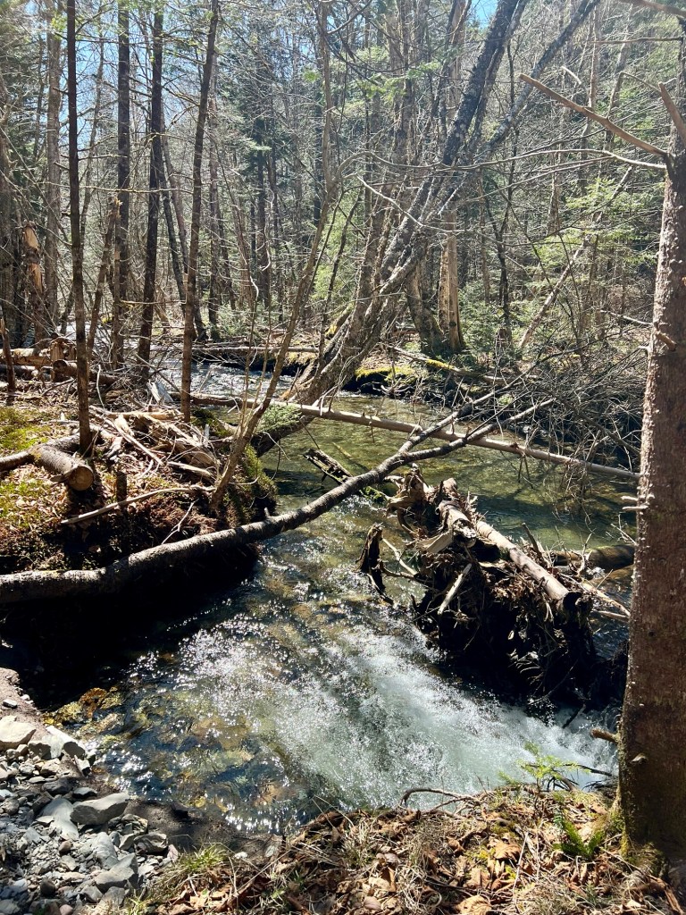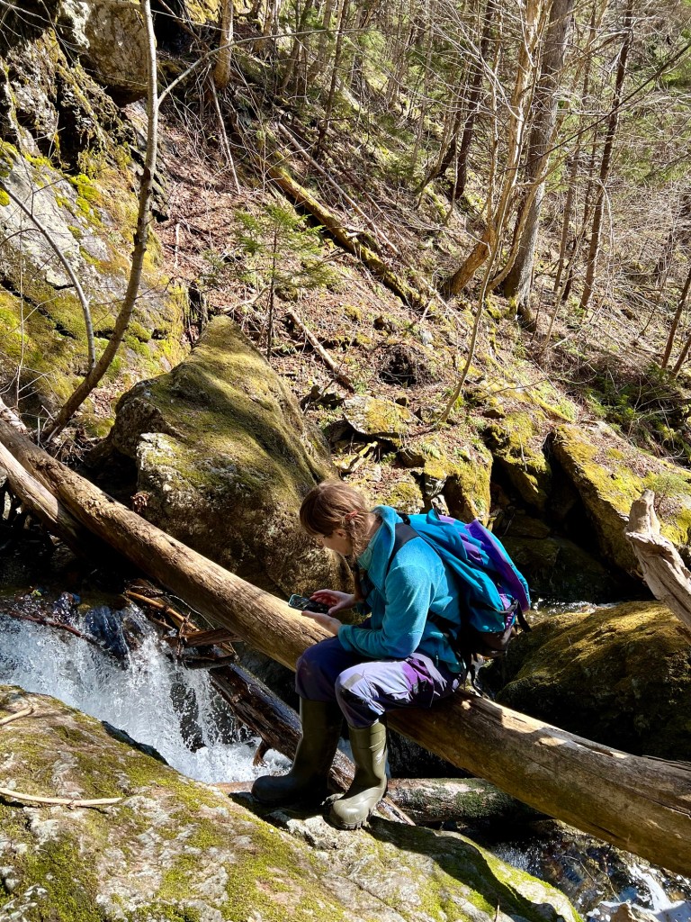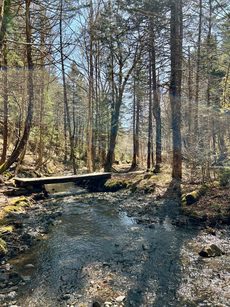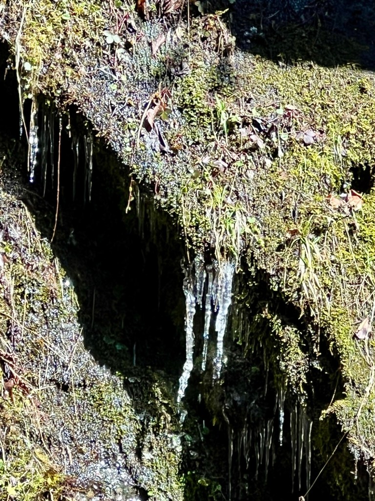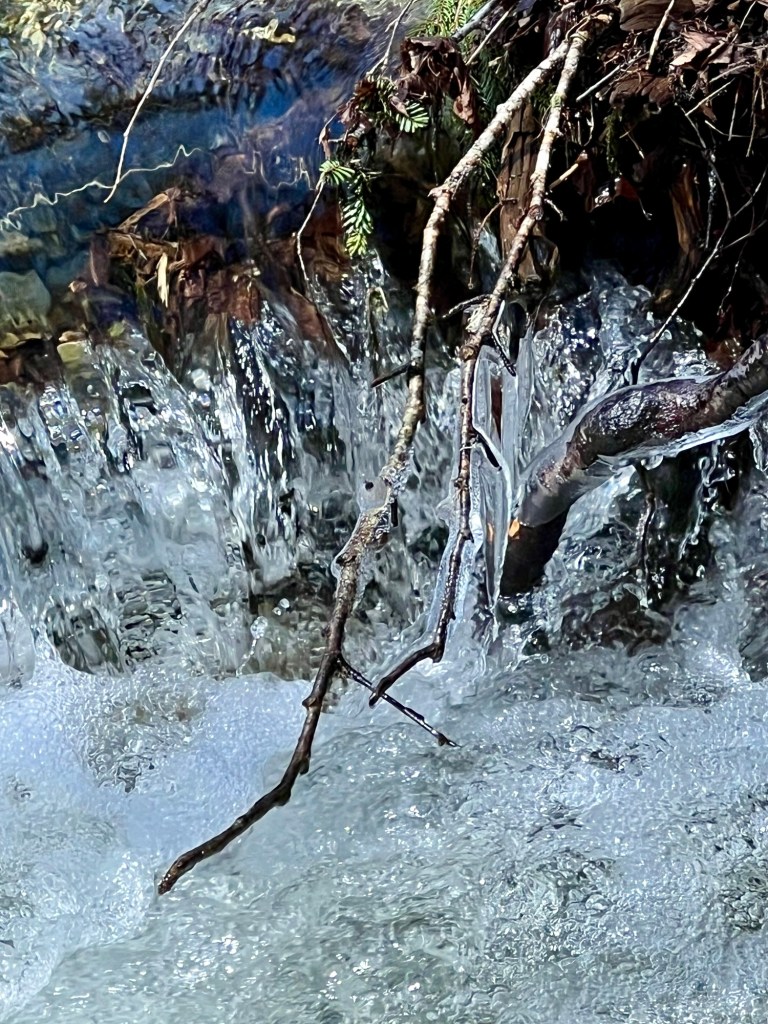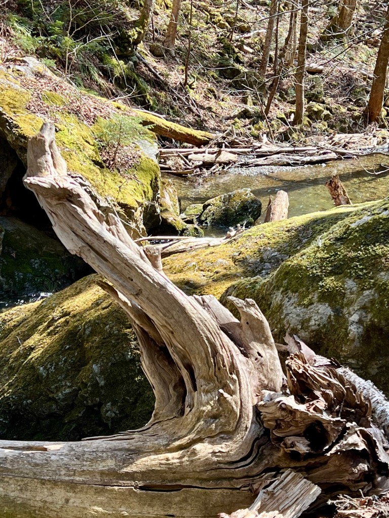 The trail to Wards Falls holds treasures to discover any time of the year. We were happy it wasn’t too muddy. The brook was gurgling gently as we navigated the trail of sixteen bridges, criss-crossing the woodland stream as it glistened in the sun. We even found some icicles in the shaded areas.