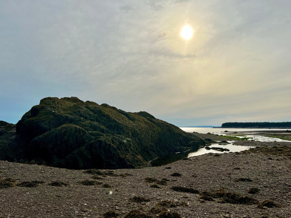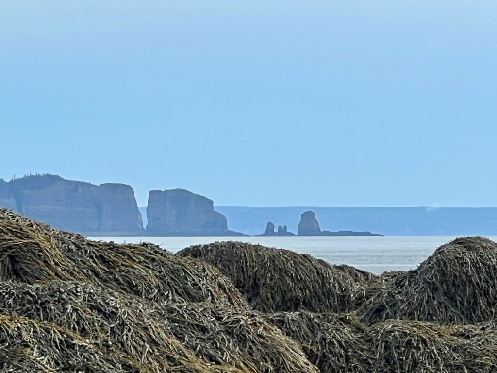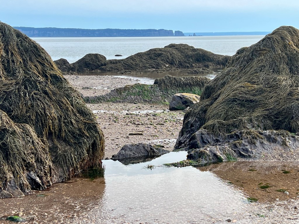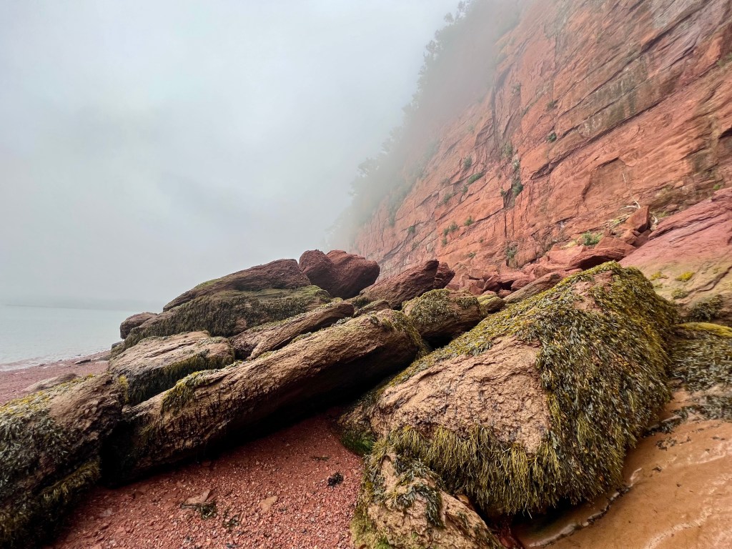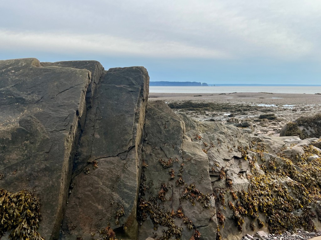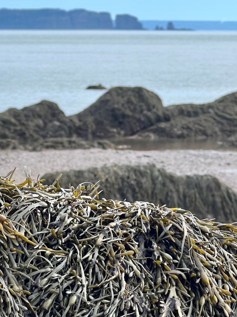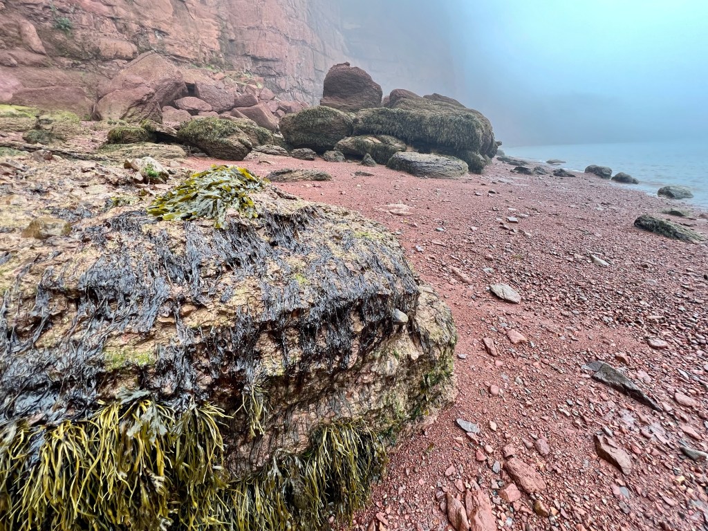 I started on familiar territory, the sandy, easy to navigate Soley Cove beach and finished at Five Islands Provincial Park Day-use Area. There was sand, red mud, seaweed hiding some quicksand-like sections that sucked my legs in to well above my ankles and, just when I thought I had reached the Old Wife Formation, my balance was challenged by clambering over seaweed and barnacle covered basalt rocks. Four hours well spent! I won’t lie, this was a challenging solo-hike despite careful preparation. Would I make this into a tour? The answer is a firm “no”.
