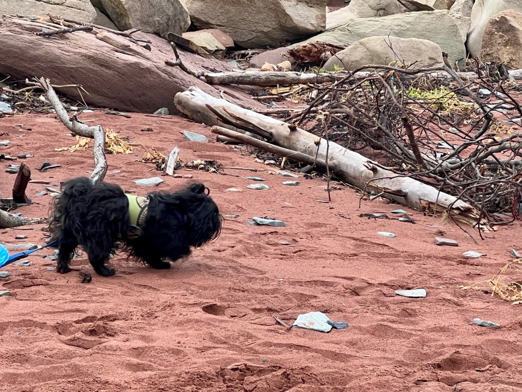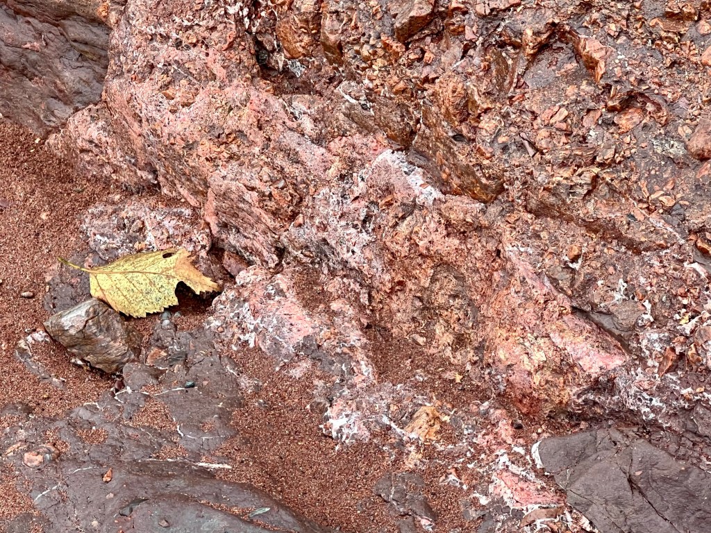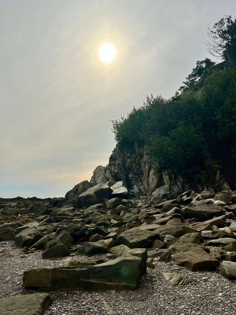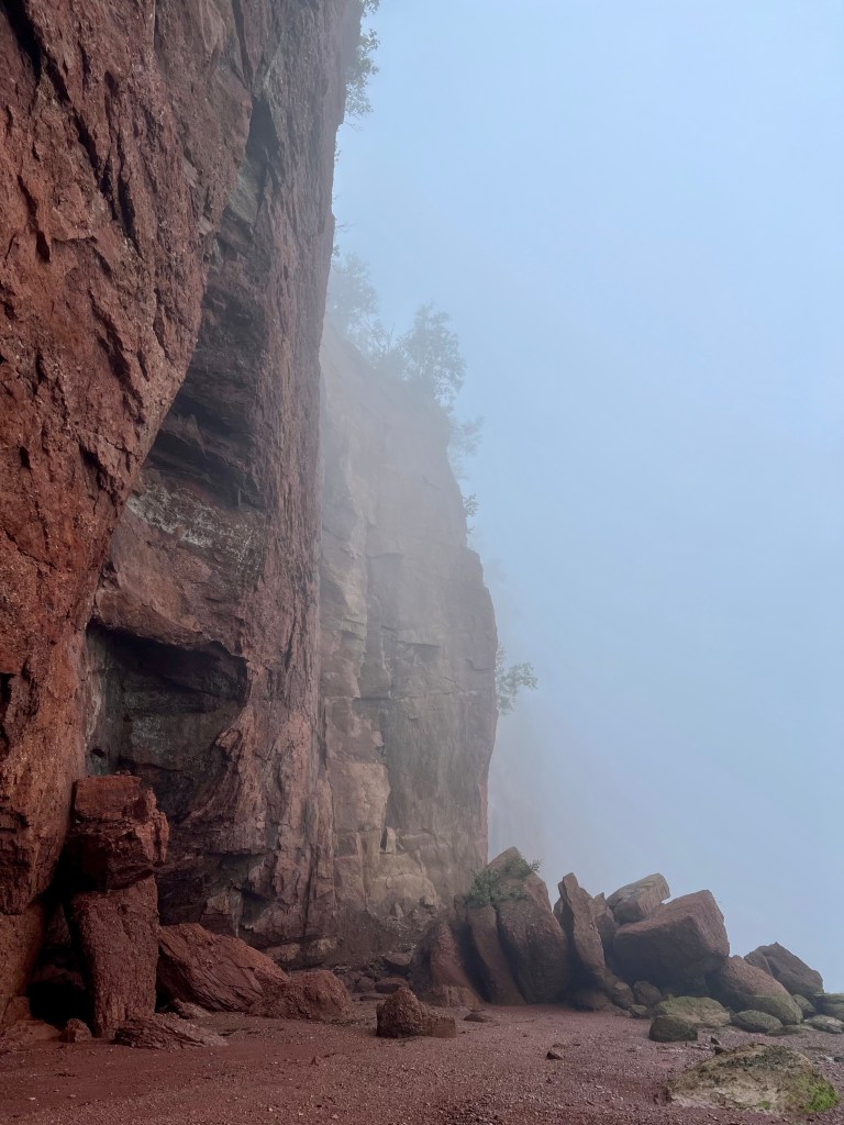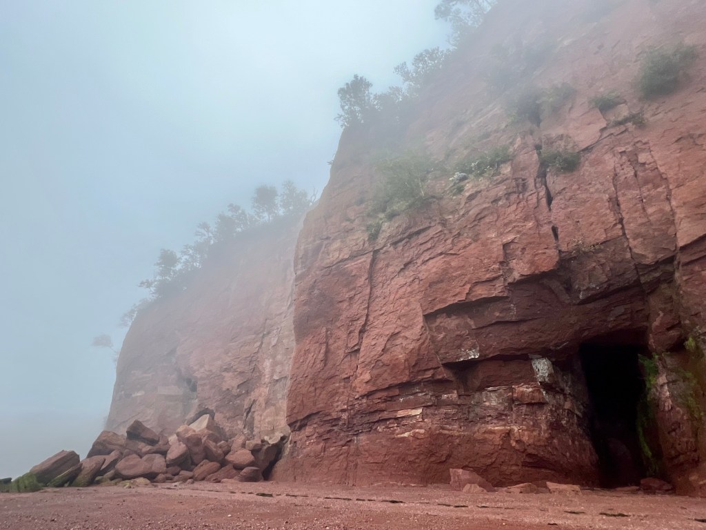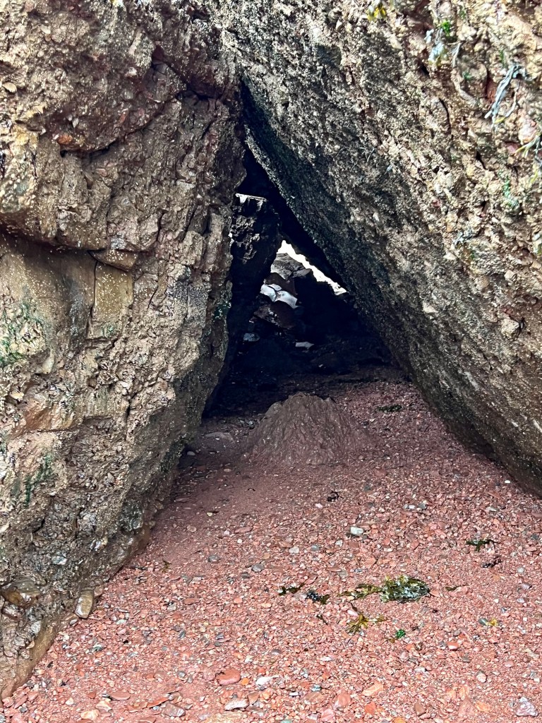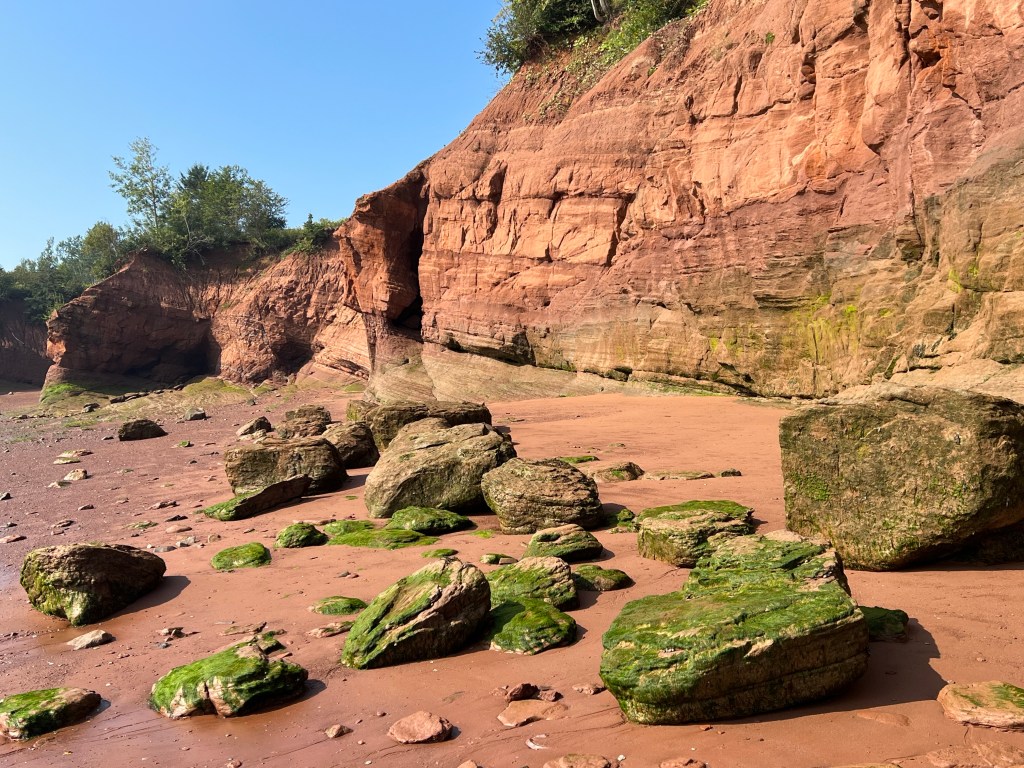 I started on familiar territory, the sandy, easy to navigate Soley Cove beach and finished at Five Islands Provincial Park Day-use Area. There was sand, red mud, seaweed hiding some quicksand-like sections that sucked my legs in to well above my ankles and, just when I thought I had reached the Old Wife Formation, my balance was challenged by clambering over seaweed and barnacle covered basalt rocks. Four hours well spent! I won’t lie, this was a challenging solo-hike despite careful preparation. Would I make this into a tour? The answer is a firm “no”.