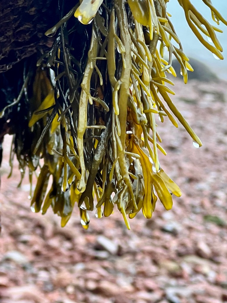 …brightly coloured sea lettuce still dripping with moisture, sandbars slowly emerging from the receding waters and coloured pebbles in sea water puddles.