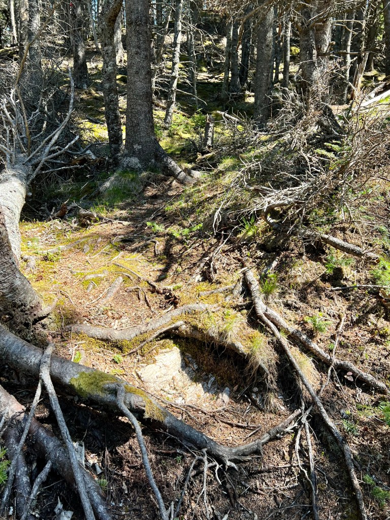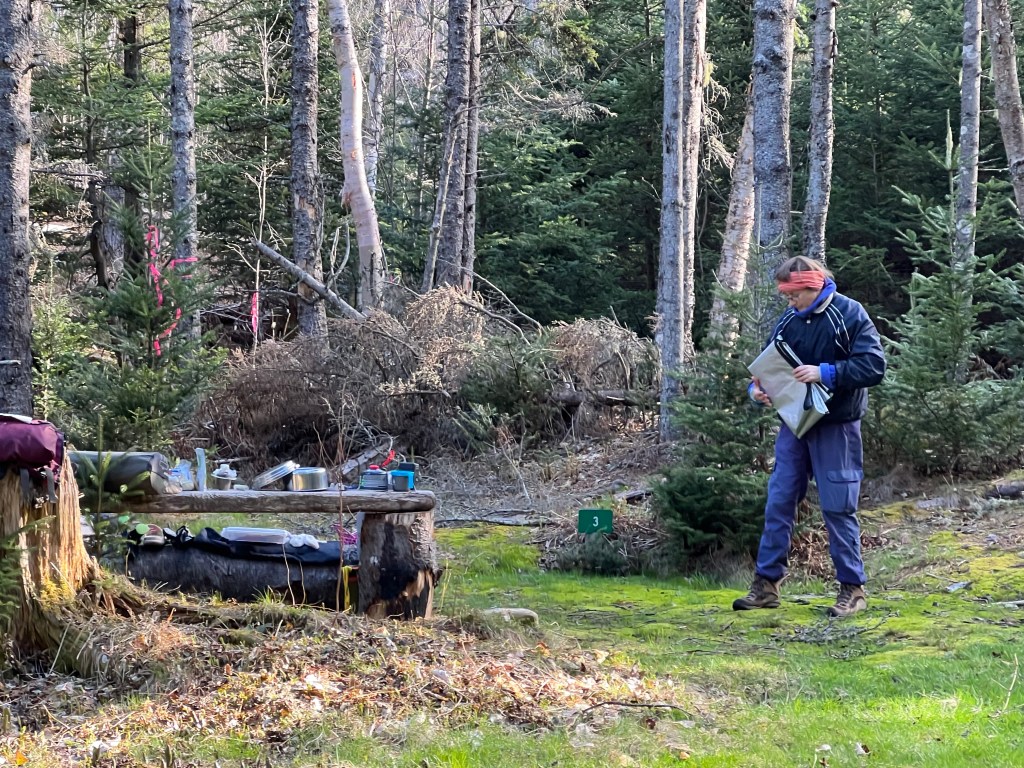 After 15 km of ascends and descents through springtime woodlands on Friday and a chilly night below the full moon, we woke up early to frost-kissed leaves. Brian estimated that it got to -3 to -5C. I believe it… the way the cold kept creeping up from my lower back to my shoulders was annoying. I had about two hours of continued sleep. But the anticipation soon took over again. Tent and cooking supplies packed away after a cup of coffee and breakfast we lifted our heavy packs back onto our shoulders and turned toward Seal Cove.