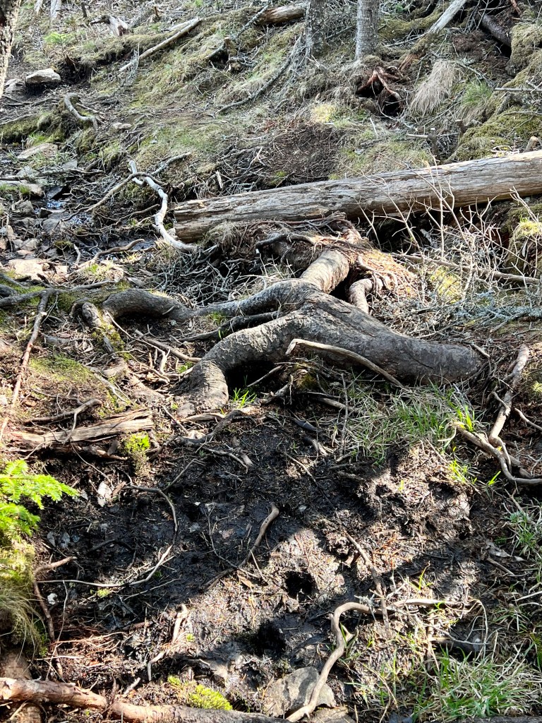 I classify Day Three of our hike the one with the most magnificent views. Experiencing these views is a privilege that comes with a price: navigating a most challenging trail! There were up and downhill scrambles over loose rocks with tree roots to hold onto for balance. I tried to not make myself think about that if a root was too weak to hold me and my pack what the consequences might be. There were sections where all I could do is take the next step and not look ahead or back for fear I might lose my balance. Gaby said it best when she reminded us that it was not just about one’s physical stamina but that being mentally alert was just as taxing while negotiating large boggy sections, scattered rocks or narrow logs to negotiate across a running stream or simply finding the appropriate root on a steep section of trail where we could firmly plant our boot before advancing.